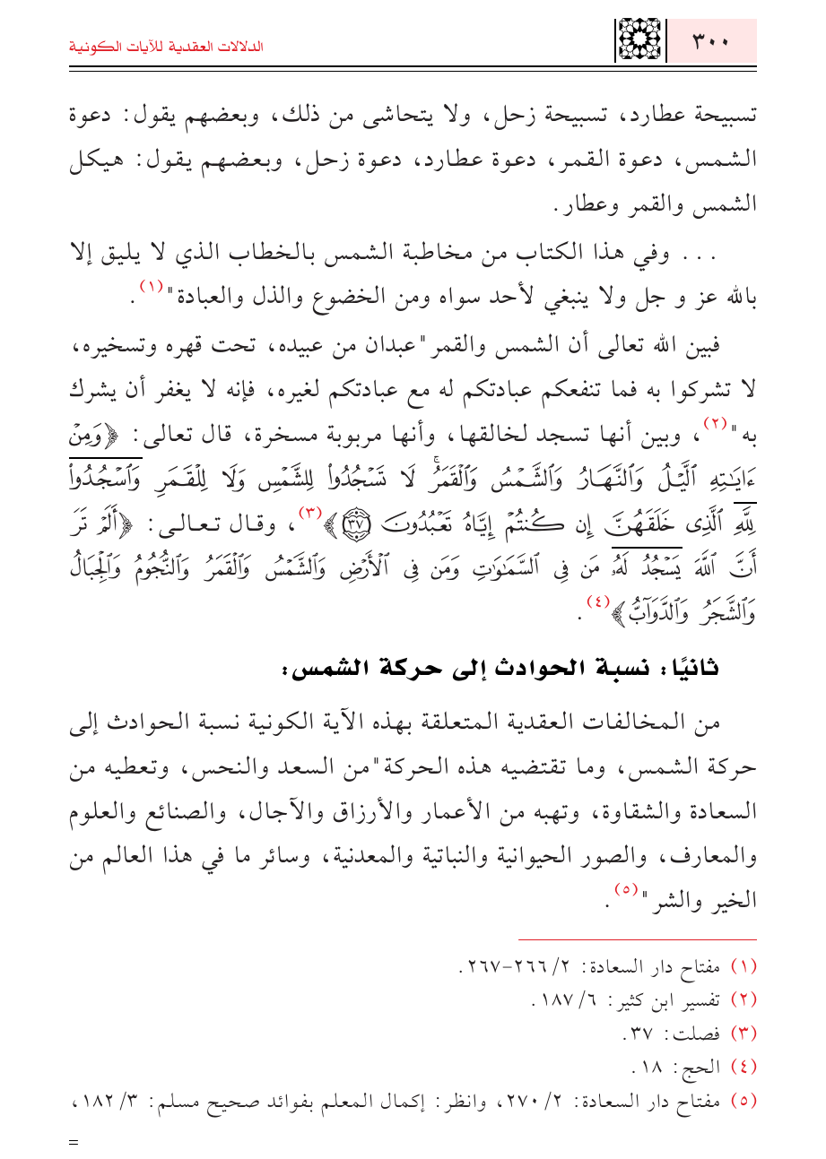 من القوادح العقدية المتعلقة بهذه الآية الكونية نسبة الحوادث إلى حركة الشمس، وما تقتضيه هذه الحركة"من السعد والنحس، وتعطيه من السعادة والشقاوة، وتهبه من الأعمار والأرزاق والآجال، والصنائع والعلوم والمعارف، والصور الحيوانية والنباتية والمعدنية، وسائر ما في هذا العالم من الخير والشر" (¬٥).