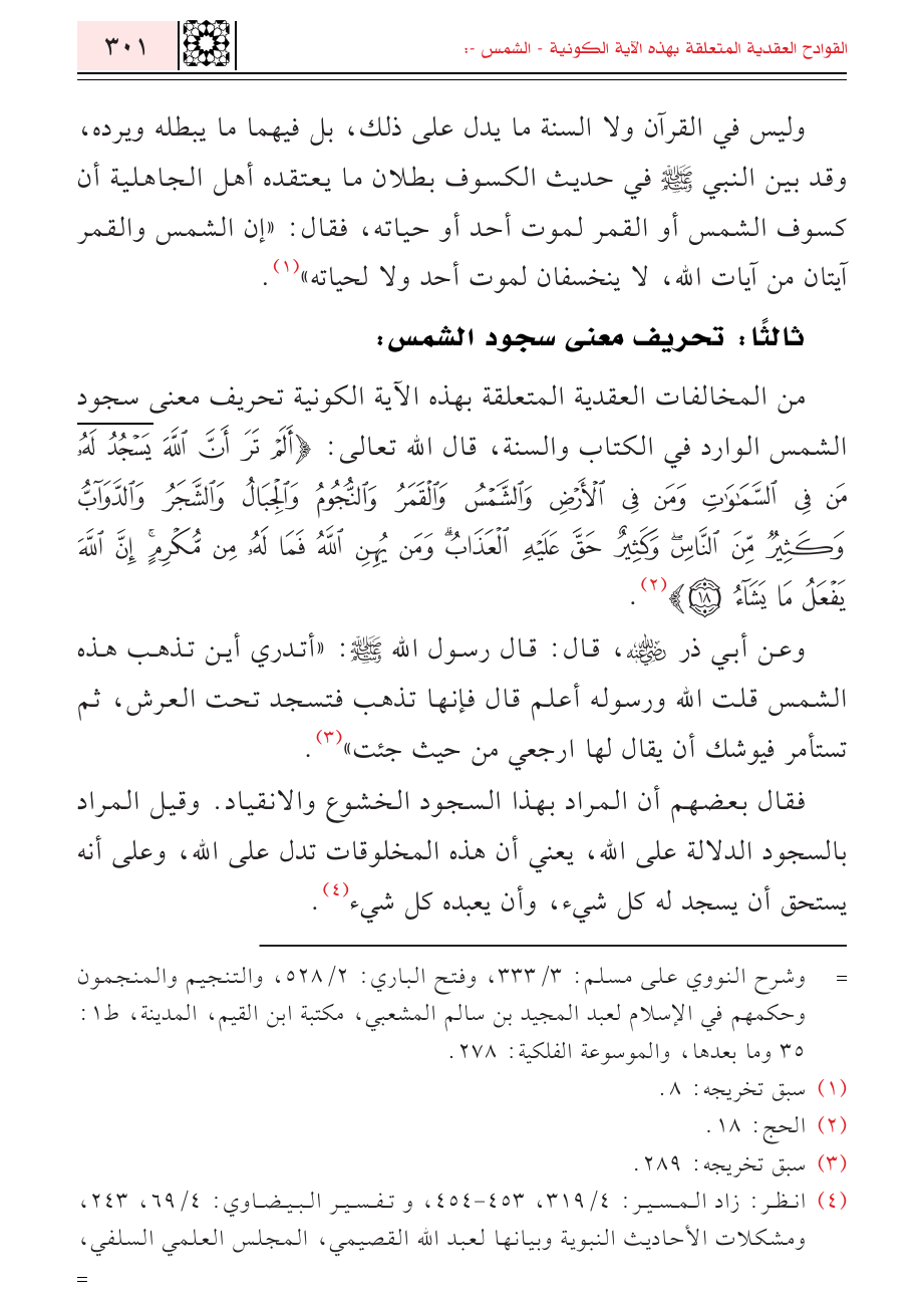 من المخالفات العقدية المتعلقة بهذه الآية الكونية تحريف معنى سجود الشمس الوارد في الكتاب والسنة، قال الله تعالى: {أَلَمْ تَرَ أَنَّ اللَّهَ يَسْجُدُ لَهُ مَنْ فِي السَّمَاوَاتِ وَمَنْ فِي الْأَرْضِ وَالشَّمْسُ وَالْقَمَرُ وَالنُّجُومُ وَالْجِبَالُ وَالشَّجَرُ وَالدَّوَابُّ وَكَثِيرٌ مِنَ النَّاسِ وَكَثِيرٌ حَقَّ عَلَيْهِ الْعَذَابُ وَمَنْ يُهِنِ اللَّهُ فَمَا لَهُ مِنْ مُكْرِمٍ إِنَّ اللَّهَ يَفْعَلُ مَا يَشَاءُ} (¬٢).