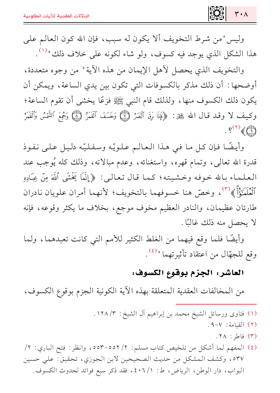 والتخويف الذي يحصل لأهل الإيمان من هذه الآية" من وجوه متعددة، أوضحها: أن ذلك مذكر بالكسوفات التي تكون بين يدي الساعة، ويمكن أن يكون ذلك الكسوف منها، ولذلك قام النبي - صلى الله عليه وسلم - فزعًا يخشى أن تقوم الساعة؛ وكيف لا وقد قال الله - عز وجل -: {فَإِذَا بَرِقَ الْبَصَرُ (٧) وَخَسَفَ الْقَمَرُ (٨) وَجُمِعَ الشَّمْسُ وَالْقَمَرُ} (¬٢)؟ .