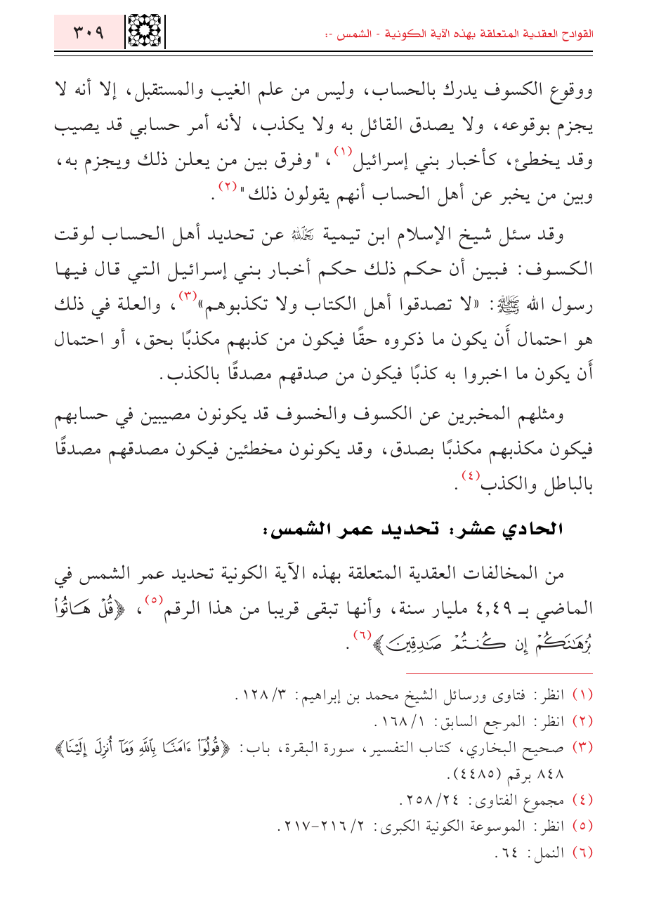 وقد سئل شيخ الإسلام ابن تيمية - رحمه الله - عن تحديد أهل الحساب لوقت الكسوف: فبين أن حكم ذلك حكم أخبار بني إسرائيل التي قال فيها رسول الله - صلى الله عليه وسلم -: " لا تصدقوا أهل الكتاب ولا تكذبوهم" (¬٣)، والعلة في ذلك هو احتمال أَن يكون ما ذكروه حقًا فيكون من كذبهم مكذبًا بحق، أو احتمال أَن يكون ما اخبروا به كذبًا فيكون من صدقهم مصدقًا بالكذب.