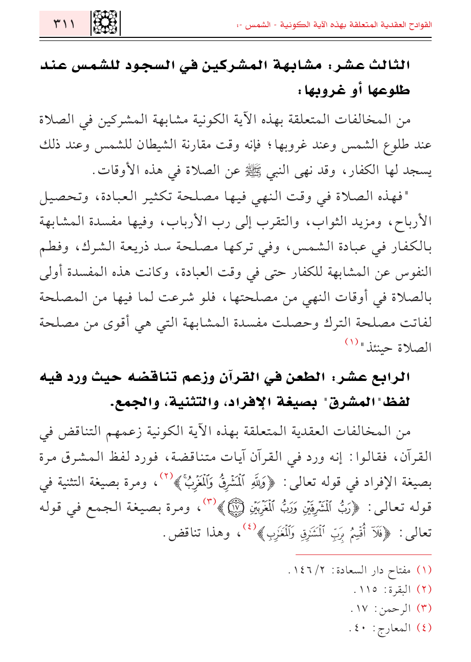 الرابع عشر: الطعن في القرآن وزعم تناقضه حيث ورد فيه لفظ "المشرق" بصيغة الإفراد، والتثنية، والجمع.