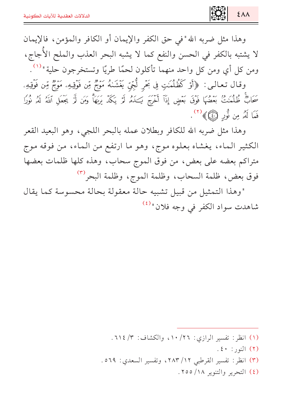 وقال تعالى: {أَوْ كَظُلُمَاتٍ فِي بَحْرٍ لُجِّيٍّ يَغْشَاهُ مَوْجٌ مِنْ فَوْقِهِ مَوْجٌ مِنْ فَوْقِهِ سَحَابٌ ظُلُمَاتٌ بَعْضُهَا فَوْقَ بَعْضٍ إِذَا أَخْرَجَ يَدَهُ لَمْ يَكَدْ يَرَاهَا وَمَنْ لَمْ يَجْعَلِ اللَّهُ لَهُ نُورًا فَمَا لَهُ مِنْ نُورٍ} (¬٢).