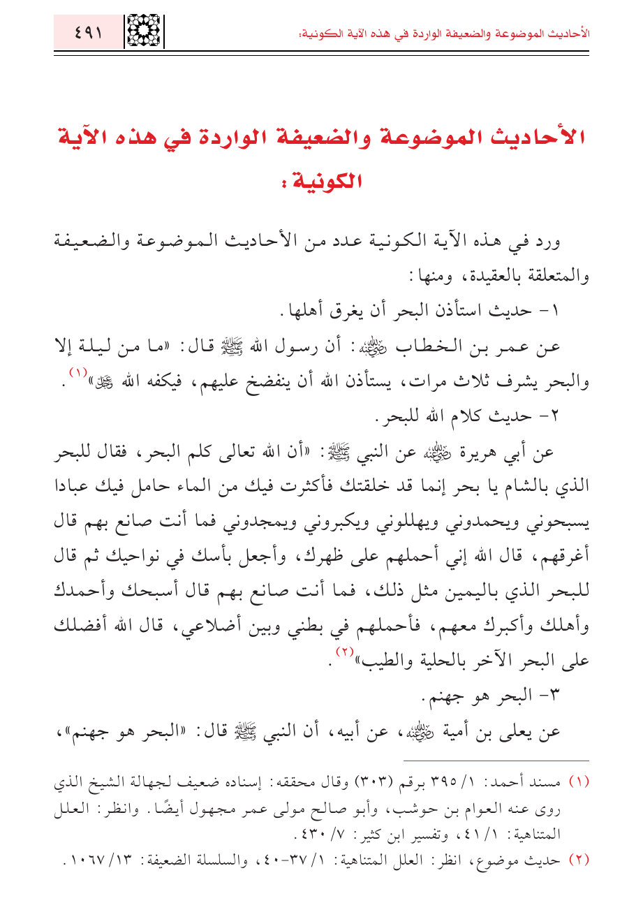 (¬١) مسند أحمد: ١/ ٣٩٥ برقم (٣٠٣) وقال محققه: إسناده ضعيف لجهالة الشيخ الذي روى عنه العوام بن حوشب، وأبو صالح مولى عمر مجهول أيضاً. وانظر: العلل المتناهية: ١/ ٤١، وتفسير ابن كثير: ٧/ ٤٣٠.
