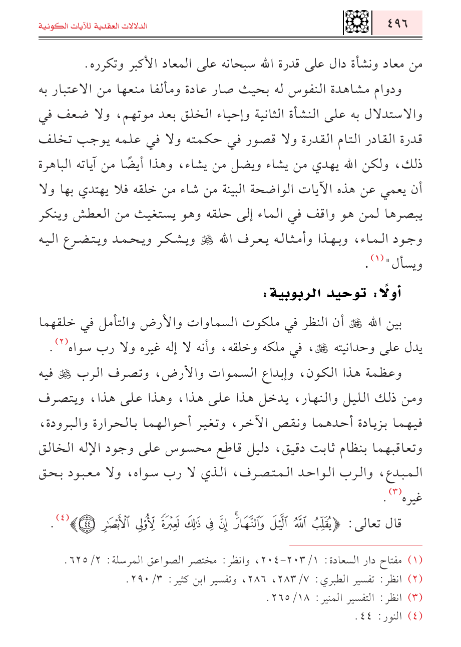 وعظمة هذا الكون، وإبداع السموات والأرض، وتصرف الرب - عز وجل - فيه ومن ذلك الليل والنهار، يدخل هذا على هذا، وهذا على هذا، ويتصرف فيهما بزيادة أحدهما ونقص الآخر، وتغير أحوالهما بالحرارة والبرودة، وتعاقبهما بنظام ثابت دقيق، دليل قاطع محسوس على وجود الإله الخالق المبدع، والرب الواحد المتصرف، الذي لا رب سواه، ولا معبود بحق غيره (¬٣).