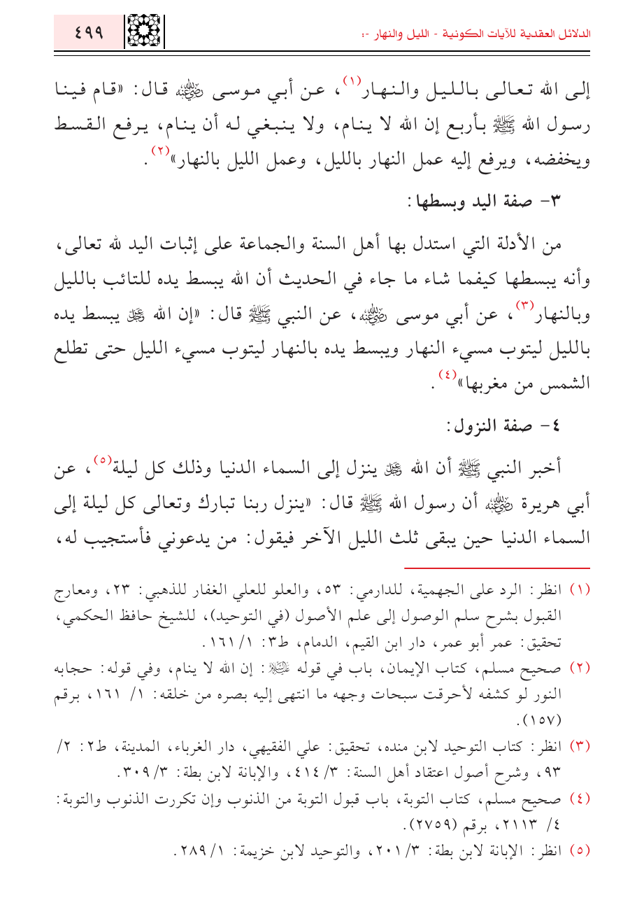 من الأدلة التي استدل بها أهل السنة والجماعة على إثبات اليد لله تعالى، وأنه يبسطها كيفما شاء ما جاء في الحديث أن الله يبسط يده للتائب بالليل وبالنهار (¬٣)، عن أبي موسى - رضي الله عنه -، عن النبي - صلى الله عليه وسلم - قال: "إن الله - عز وجل - يبسط يده بالليل ليتوب مسيء النهار ويبسط يده بالنهار ليتوب مسيء الليل حتى تطلع الشمس من مغربها" (¬٤).