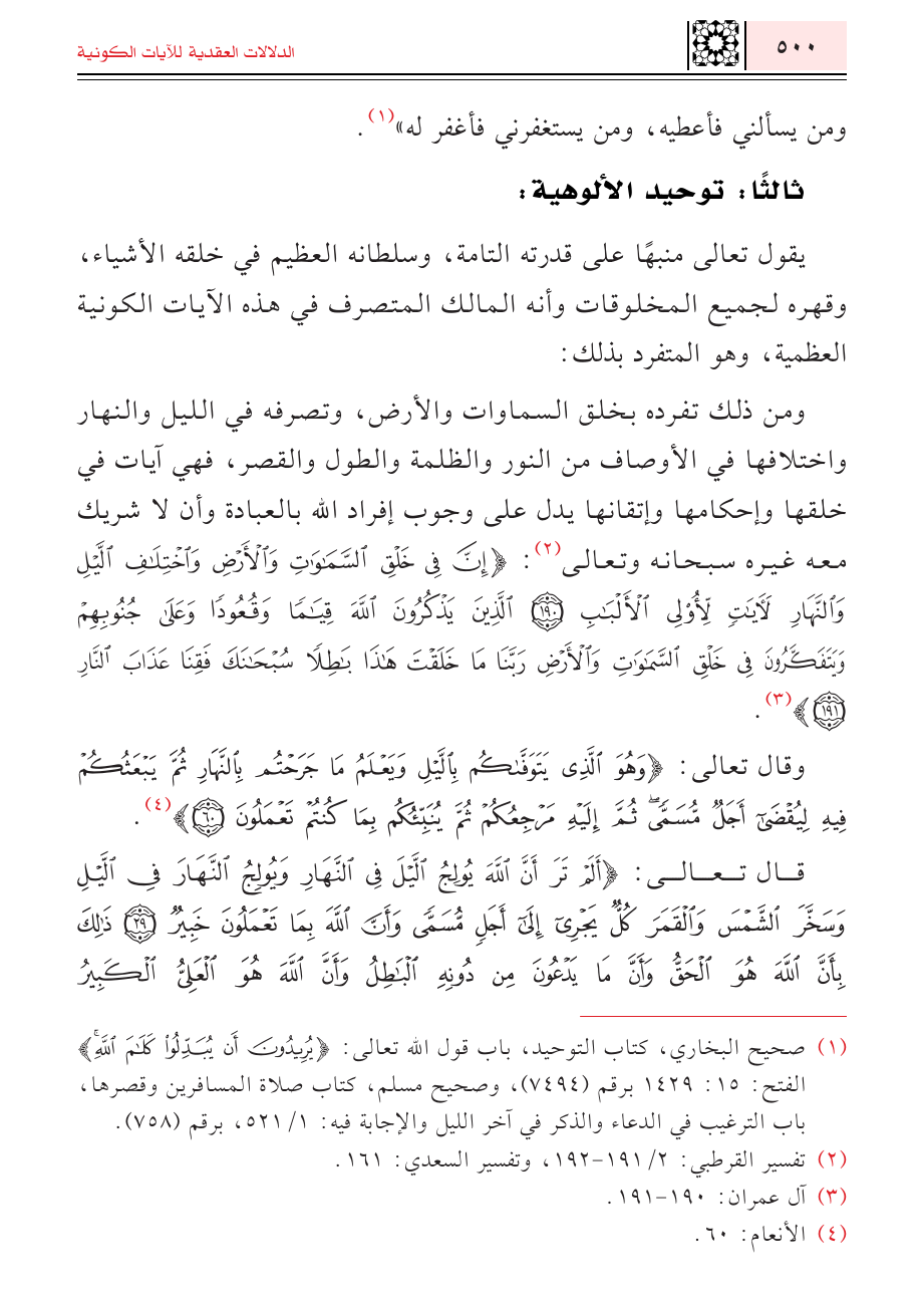 ومن ذلك تفرده بخلق السماوات والأرض، وتصرفه في الليل والنهار واختلافها في الأوصاف من النور والظلمة والطول والقصر، فهي آيات في خلقها وإحكامها وإتقانها يدل على وجوب إفراد الله بالعبادة وأن لا شريك معه غيره سبحانه وتعالى (¬٢): {إِنَّ فِي خَلْقِ السَّمَاوَاتِ وَالْأَرْضِ وَاخْتِلَافِ اللَّيْلِ وَالنَّهَارِ لَآيَاتٍ لِأُولِي الْأَلْبَابِ (١٩٠) الَّذِينَ يَذْكُرُونَ اللَّهَ قِيَامًا وَقُعُودًا وَعَلَى جُنُوبِهِمْ وَيَتَفَكَّرُونَ فِي خَلْقِ السَّمَاوَاتِ وَالْأَرْضِ رَبَّنَا مَا خَلَقْتَ هَذَا بَاطِلًا سُبْحَانَكَ فَقِنَا عَذَابَ النَّارِ} (¬٣).