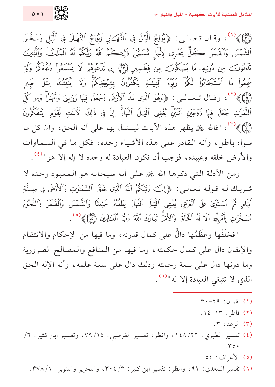 (٣٠)} (¬١)، وقال تعالى: {يُولِجُ اللَّيْلَ فِي النَّهَارِ وَيُولِجُ النَّهَارَ فِي اللَّيْلِ وَسَخَّرَ الشَّمْسَ وَالْقَمَرَ كُلٌّ يَجْرِي لِأَجَلٍ مُسَمًّى ذَلِكُمُ اللَّهُ رَبُّكُمْ لَهُ الْمُلْكُ وَالَّذِينَ تَدْعُونَ مِنْ دُونِهِ مَا يَمْلِكُونَ مِنْ قِطْمِيرٍ (١٣) إِنْ تَدْعُوهُمْ لَا يَسْمَعُوا دُعَاءَكُمْ وَلَوْ سَمِعُوا مَا اسْتَجَابُوا لَكُمْ وَيَوْمَ الْقِيَامَةِ يَكْفُرُونَ بِشِرْكِكُمْ وَلَا يُنَبِّئُكَ مِثْلُ خَبِيرٍ} (¬٢)، وقال تعالى: {وَهُوَ الَّذِي مَدَّ الْأَرْضَ وَجَعَلَ فِيهَا رَوَاسِيَ وَأَنْهَارًا وَمِنْ كُلِّ الثَّمَرَاتِ جَعَلَ فِيهَا زَوْجَيْنِ اثْنَيْنِ يُغْشِي اللَّيْلَ النَّهَارَ إِنَّ فِي ذَلِكَ لَآيَاتٍ لِقَوْمٍ يَتَفَكَّرُونَ} (¬٣)، "فالله - عز وجل - يظهر هذه الآيات ليستدل بها على أنه الحق، وأن كل ما سواه باطل، وأنه القادر على هذه الأشياء وحده، فكل ما في السماوات والأرض خلقه وعبيده، فوجب أن تكون العبادة له وحده لا إله إلا هو" (¬٤).
