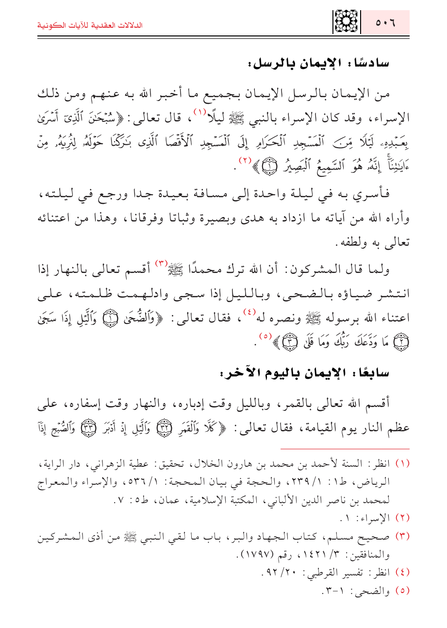من الإيمان بالرسل الإيمان بجميع ما أخبر الله به عنهم ومن ذلك الإسراء، وقد كان الإسراء بالنبي - صلى الله عليه وسلم - ليلاً (¬١)، قال تعالى: {سُبْحَانَ الَّذِي أَسْرَى بِعَبْدِهِ لَيْلًا مِنَ الْمَسْجِدِ الْحَرَامِ إِلَى الْمَسْجِدِ الْأَقْصَى الَّذِي بَارَكْنَا حَوْلَهُ لِنُرِيَهُ مِنْ آيَاتِنَا إِنَّهُ هُوَ السَّمِيعُ الْبَصِيرُ} (¬٢).