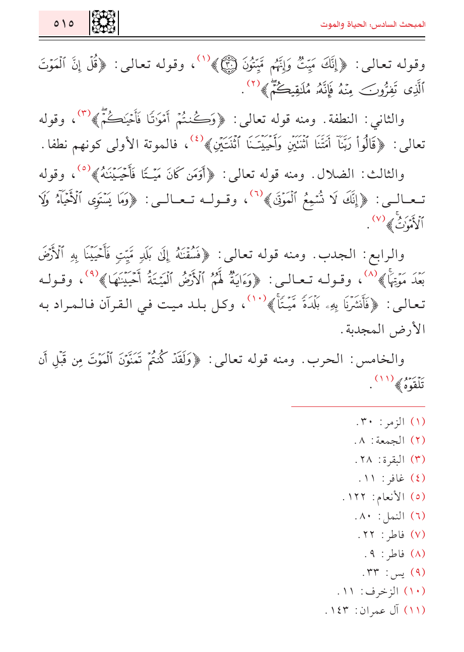 وقوله تعالى: {إِنَّكَ مَيِّتٌ وَإِنَّهُمْ مَيِّتُونَ} (¬١)، وقوله تعالى: {قُلْ إِنَّ الْمَوْتَ الَّذِي تَفِرُّونَ مِنْهُ فَإِنَّهُ مُلَاقِيكُمْ} (¬٢).