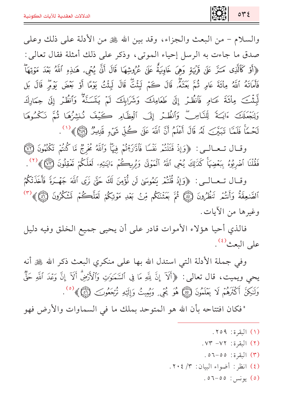 والسلام- من البعث والجزاء، وقد بين الله - عز وجل - من الأدلة على ذلك وعلى صدق ما جاءت به الرسل إحياء الموتى، وذكر على ذلك أمثلة فقال تعالى: {أَوْ كَالَّذِي مَرَّ عَلَى قَرْيَةٍ وَهِيَ خَاوِيَةٌ عَلَى عُرُوشِهَا قَالَ أَنَّى يُحْيِي هَذِهِ اللَّهُ بَعْدَ مَوْتِهَا فَأَمَاتَهُ اللَّهُ مِائَةَ عَامٍ ثُمَّ بَعَثَهُ قَالَ كَمْ لَبِثْتَ قَالَ لَبِثْتُ يَوْمًا أَوْ بَعْضَ يَوْمٍ قَالَ بَلْ لَبِثْتَ مِائَةَ عَامٍ فَانْظُرْ إِلَى طَعَامِكَ وَشَرَابِكَ لَمْ يَتَسَنَّهْ وَانْظُرْ إِلَى حِمَارِكَ وَلِنَجْعَلَكَ آيَةً لِلنَّاسِ وَانْظُرْ إِلَى الْعِظَامِ كَيْفَ نُنْشِزُهَا ثُمَّ نَكْسُوهَا لَحْمًا فَلَمَّا تَبَيَّنَ لَهُ قَالَ أَعْلَمُ أَنَّ اللَّهَ عَلَى كُلِّ شَيْءٍ قَدِيرٌ} (¬١).
