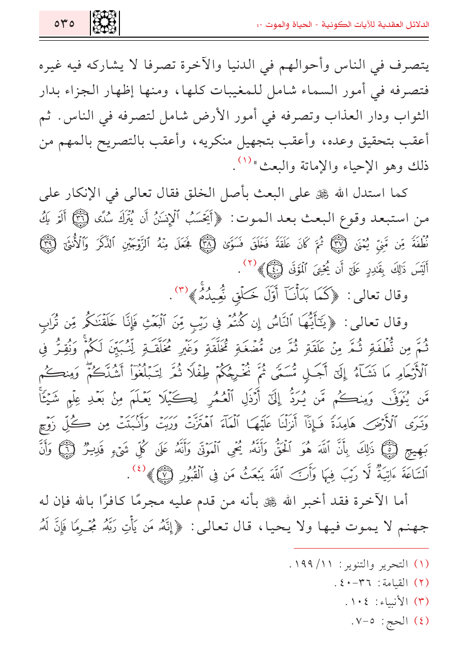 وقال تعالى: {يَاأَيُّهَا النَّاسُ إِنْ كُنْتُمْ فِي رَيْبٍ مِنَ الْبَعْثِ فَإِنَّا خَلَقْنَاكُمْ مِنْ تُرَابٍ ثُمَّ مِنْ نُطْفَةٍ ثُمَّ مِنْ عَلَقَةٍ ثُمَّ مِنْ مُضْغَةٍ مُخَلَّقَةٍ وَغَيْرِ مُخَلَّقَةٍ لِنُبَيِّنَ لَكُمْ وَنُقِرُّ فِي الْأَرْحَامِ مَا نَشَاءُ إِلَى أَجَلٍ مُسَمًّى ثُمَّ نُخْرِجُكُمْ طِفْلًا ثُمَّ لِتَبْلُغُوا أَشُدَّكُمْ وَمِنْكُمْ مَنْ يُتَوَفَّى وَمِنْكُمْ مَنْ يُرَدُّ إِلَى أَرْذَلِ الْعُمُرِ لِكَيْلَا يَعْلَمَ مِنْ بَعْدِ عِلْمٍ شَيْئًا وَتَرَى الْأَرْضَ هَامِدَةً فَإِذَا أَنْزَلْنَا عَلَيْهَا الْمَاءَ اهْتَزَّتْ وَرَبَتْ وَأَنْبَتَتْ مِنْ كُلِّ زَوْجٍ بَهِيجٍ (٥) ذَلِكَ بِأَنَّ اللَّهَ هُوَ الْحَقُّ وَأَنَّهُ يُحْيِ الْمَوْتَى وَأَنَّهُ عَلَى كُلِّ شَيْءٍ قَدِيرٌ (٦) وَأَنَّ السَّاعَةَ آتِيَةٌ لَا رَيْبَ فِيهَا وَأَنَّ اللَّهَ يَبْعَثُ مَنْ فِي الْقُبُورِ} (¬٤).