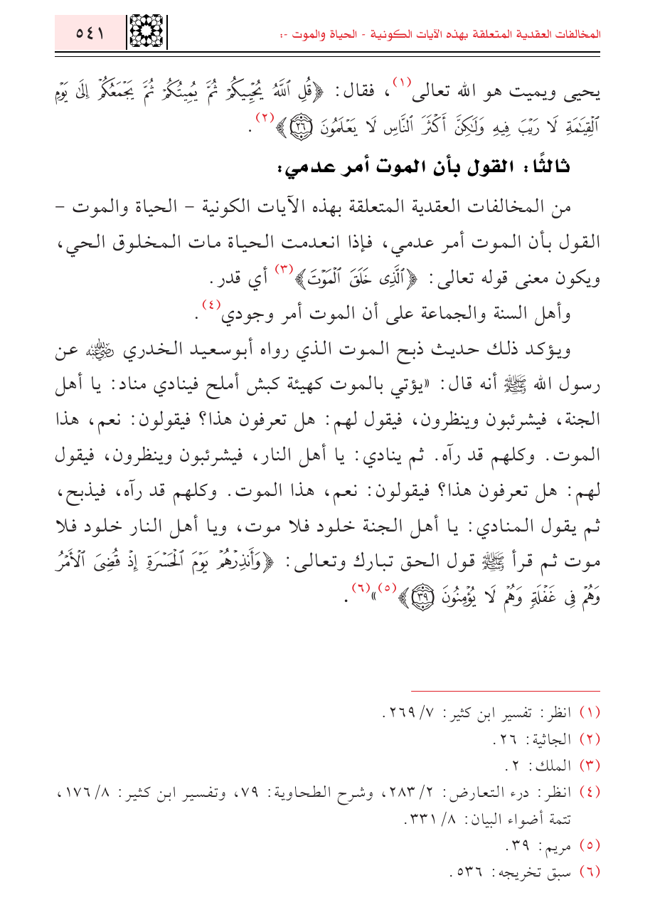 من المخالفات العقدية المتعلقة بهذه الآيات الكونية - الحياة والموت- القول بأن الموت أمر عدمي، فإذا انعدمت الحياة مات المخلوق الحي، ويكون معنى قوله تعالى: {الَّذِي خَلَقَ الْمَوْتَ} (¬٣) أي قدر.