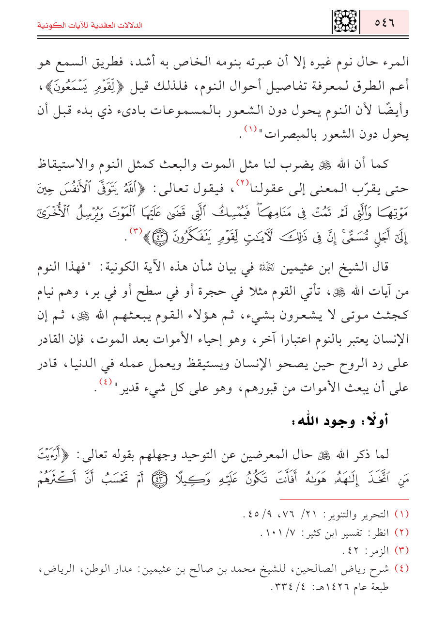قال الشيخ ابن عثيمين - رحمه الله - في بيان شأن هذه الآية الكونية: "فهذا النوم من آيات الله - عز وجل -، تأتي القوم مثلا في حجرة أو في سطح أو في بر، وهم نيام كجثث موتى لا يشعرون بشيء، ثم هؤلاء القوم يبعثهم الله - عز وجل -، ثم إن الإنسان يعتبر بالنوم اعتبارا آخر، وهو إحياء الأموات بعد الموت، فإن القادر على رد الروح حين يصحو الإنسان ويستيقظ ويعمل عمله في الدنيا، قادر على أن يبعث الأموات من قبورهم، وهو على كل شيء قدير" (¬٤).