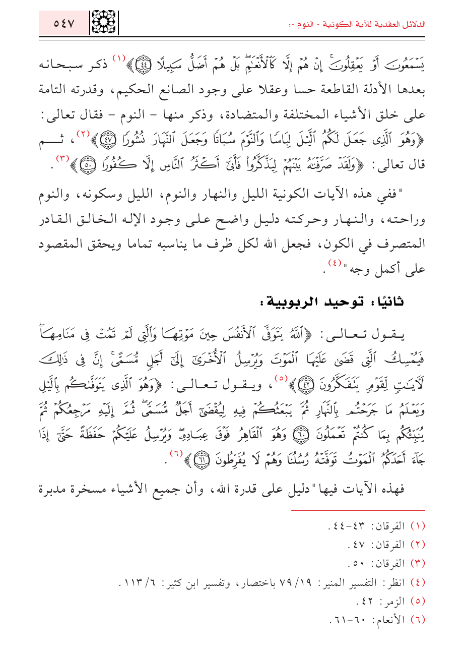 يَسْمَعُونَ أَوْ يَعْقِلُونَ إِنْ هُمْ إِلَّا كَالْأَنْعَامِ بَلْ هُمْ أَضَلُّ سَبِيلًا} (¬١) ذكر سبحانه بعدها الأدلة القاطعة حسا وعقلا على وجود الصانع الحكيم، وقدرته التامة على خلق الأشياء المختلفة والمتضادة، وذكر منها -النوم- فقال تعالى: {وَهُوَ الَّذِي جَعَلَ لَكُمُ اللَّيْلَ لِبَاسًا وَالنَّوْمَ سُبَاتًا وَجَعَلَ النَّهَارَ نُشُورًا} (¬٢)، ثم قال تعالى: {وَلَقَدْ صَرَّفْنَاهُ بَيْنَهُمْ لِيَذَّكَّرُوا فَأَبَى أَكْثَرُ النَّاسِ إِلَّا كُفُورًا} (¬٣).