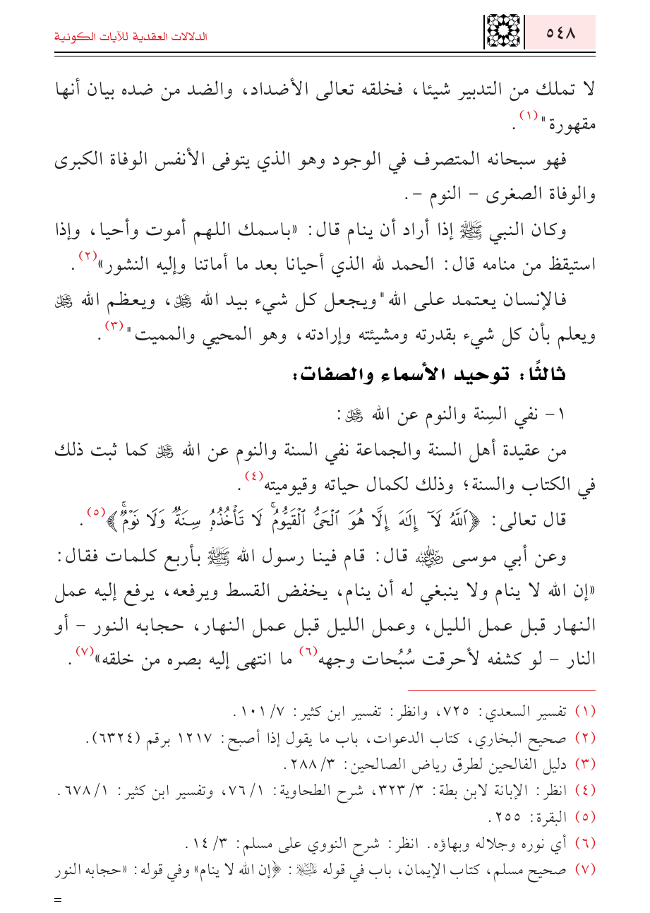 (¬٧) صحيح مسلم، كتاب الإيمان، باب في قوله - عليه السلام -: " إن الله لا ينام" وفي قوله: "حجابه النور لو كشفه لأحرق سبحات وجهه ما انتهى إليه بصره من خلقه": ١/ ١٦١، برقم (١٧٩).