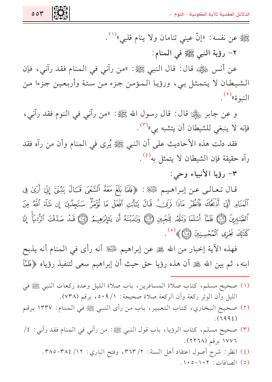 (¬٣) صحيح مسلم، كتاب الرؤيا، باب قول النبي - صلى الله عليه وسلم -: من رآني في المنام فقد رآني: ٤/ ١٧٧٦ برقم (٢٢٦٨).