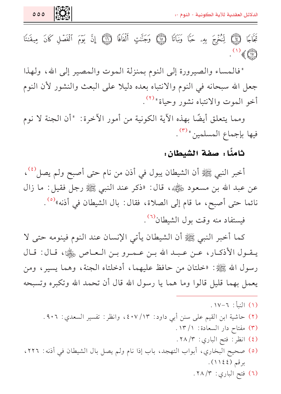 ومما يتعلق أيضاً بهذه الآية الكونية من أمور الآخرة: "أن الجنة لا نوم فيها بإجماع المسلمين" (¬٣).