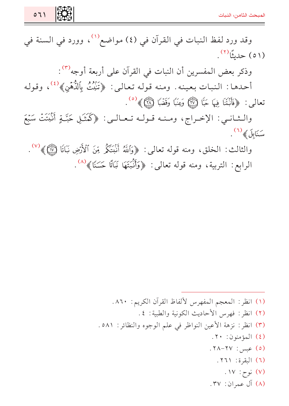 وذكر بعض المفسرين أن النبات في القرآن على أربعة أوجه (¬٣):