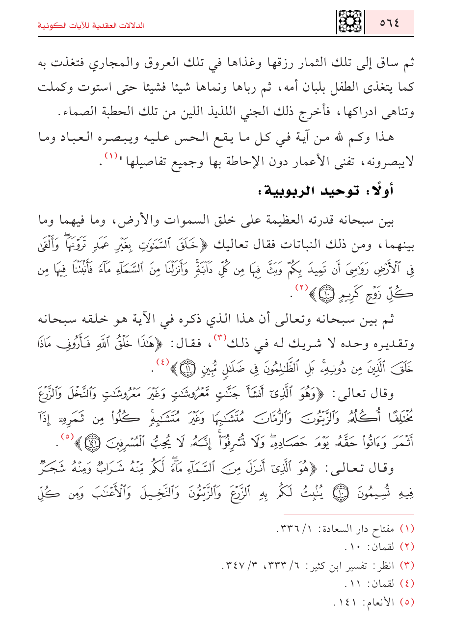 هذا وكم لله من آية في كل ما يقع الحس عليه ويبصره العباد وما لايبصرونه، تفنى الأعمار دون الإحاطة بها وجميع تفاصيلها" (¬١).