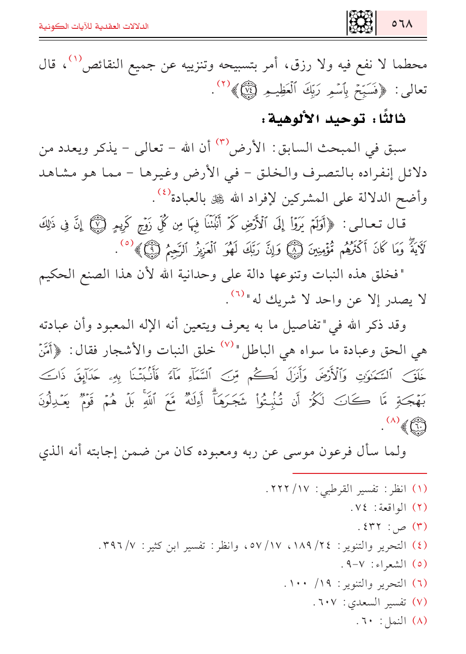 سبق في المبحث السابق: الأرض (¬٣) أن الله -تعالى- يذكر ويعدد من دلائل إنفراده بالتصرف والخلق - في الأرض وغيرها - مما هو مشاهد وأضح الدلالة على المشركين لإفراد الله - عز وجل - بالعبادة (¬٤).
