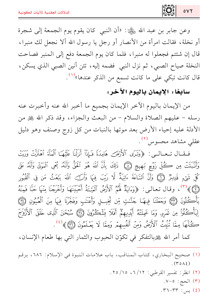 من الإيمان باليوم الآخر الإيمان بجميع ما أخبر الله عنه وأخبرت عنه رسله -عليهم الصلاة والسلام- من البعث والجزاء، وقد ذكر الله - عز وجل - من الأدلة عليه إحياء الأرض بعد موتها بالنبات من كل زوج وصنف وهو دليل عقلي مشاهد محسوس (¬٢).