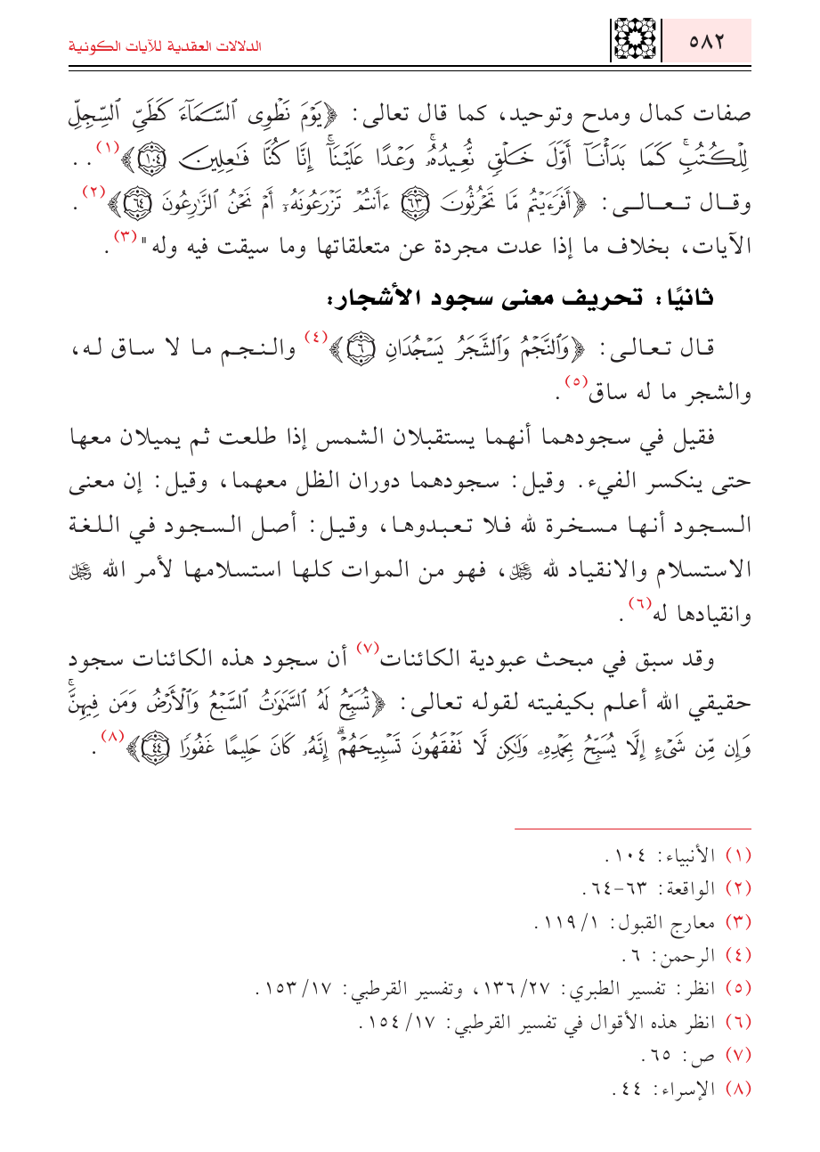 وقد سبق في مبحث عبودية الكائنات (¬٧) أن سجود هذه الكائنات سجود حقيقي الله أعلم بكيفيته لقوله تعالى: {تُسَبِّحُ لَهُ السَّمَاوَاتُ السَّبْعُ وَالْأَرْضُ وَمَنْ فِيهِنَّ وَإِنْ مِنْ شَيْءٍ إِلَّا يُسَبِّحُ بِحَمْدِهِ وَلَكِنْ لَا تَفْقَهُونَ تَسْبِيحَهُمْ إِنَّهُ كَانَ حَلِيمًا غَفُورًا} (¬٨).