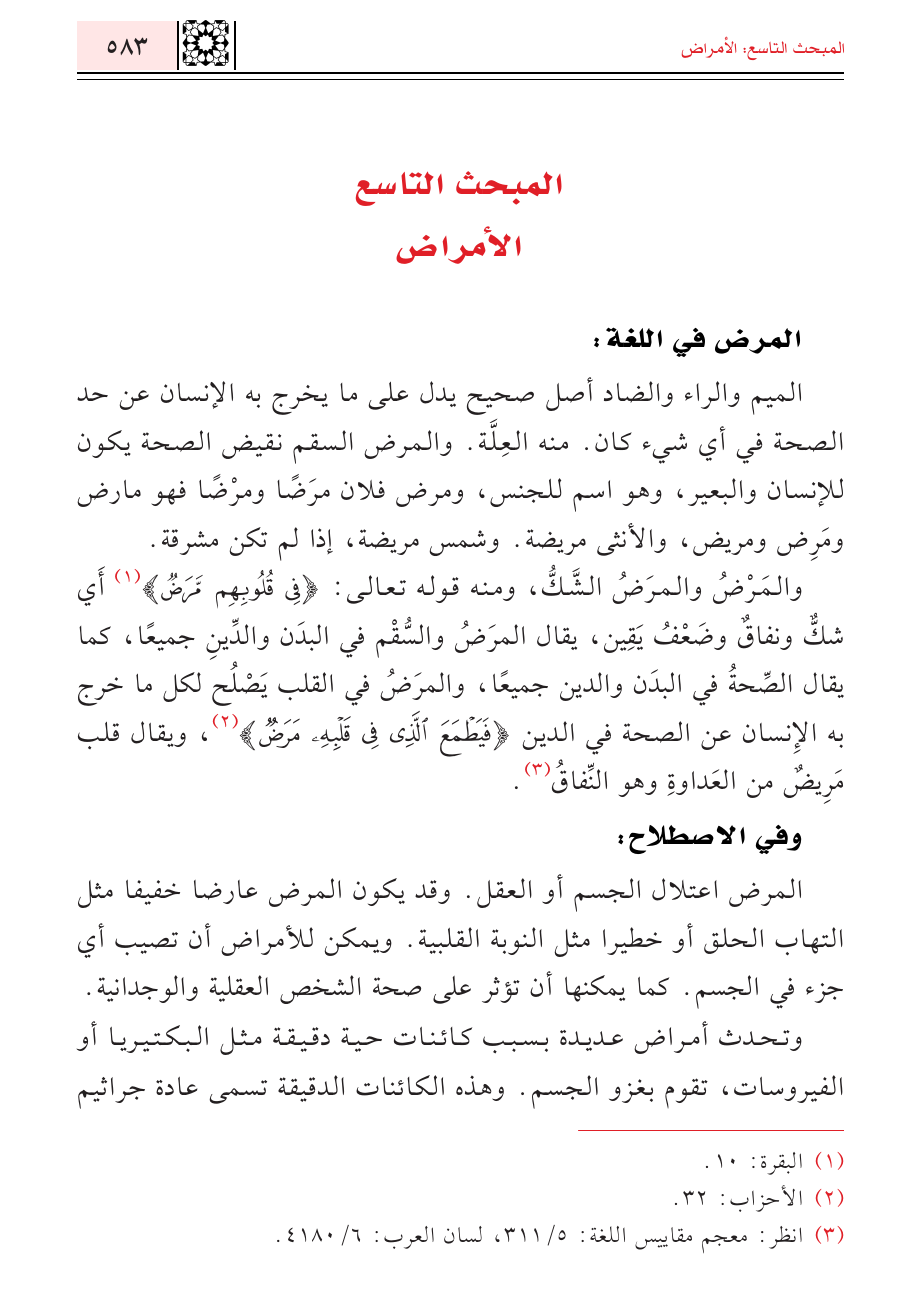 والمَرْضُ والمرَضُ الشَّكُّ، ومنه قوله تعالى: {فِي قُلُوبِهِمْ مَرَضٌ} (¬١) أَي شكٌّ ونفاقٌ وضَعْفُ يَقِين، يقال المرَضُ والسُّقْم في البدَن والدِّينِ جميعاً، كما يقال الصِّحةُ في البدَن والدين جميعاً، والمرَضُ في القلب يَصْلُح لكل ما خرج به الإِنسان عن الصحة في الدين {فَيَطْمَعَ الَّذِي فِي قَلْبِهِ مَرَضٌ} (¬٢)، ويقال قلب مَرِيضٌ من العَداوةِ وهو النِّفاقُ (¬٣).