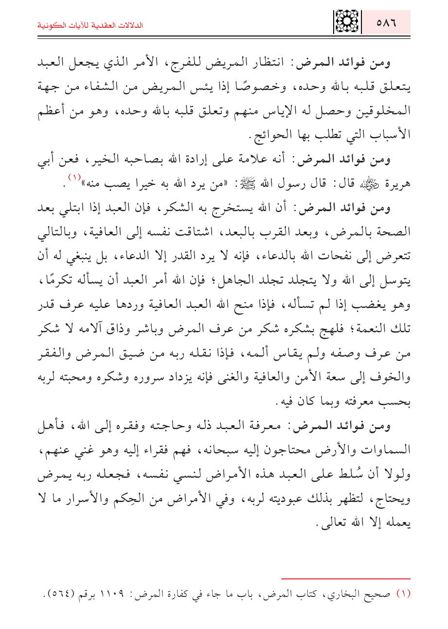 ومن فوائد المرض: أنه علامة على إرادة الله بصاحبه الخير، فعن أبي هريرة - رضي الله عنه - قال: قال رسول الله - صلى الله عليه وسلم -: " من يرد الله به خيراً يصب منه " (¬١).