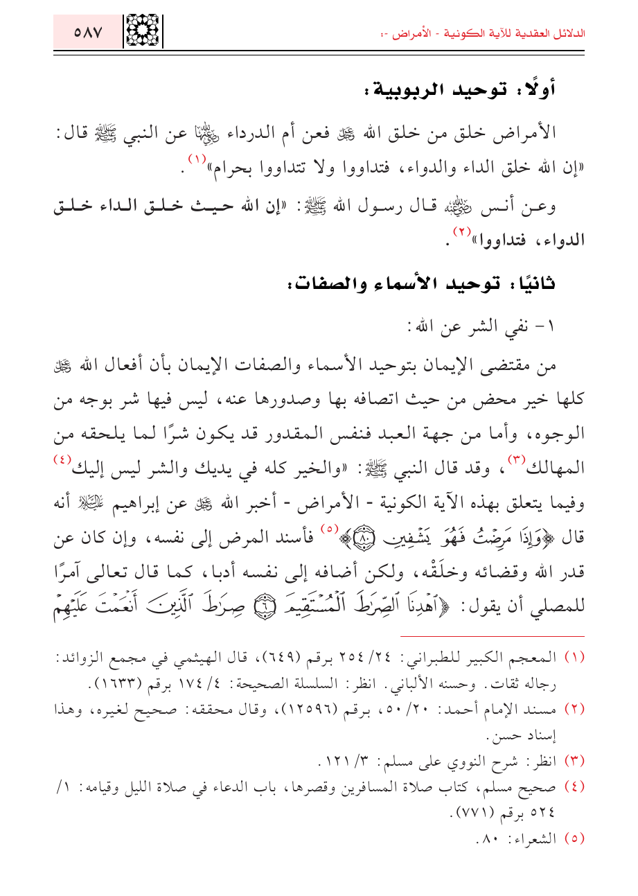 من مقتضى الإيمان بتوحيد الأسماء والصفات الإيمان بأن أفعال الله - عز وجل - كلها خير محض من حيث اتصافه بها وصدورها عنه، ليس فيها شر بوجه من الوجوه، وأما من جهة العبد فنفس المقدور قد يكون شراً لما يلحقه من المهالك (¬٣)، وقد قال النبي - صلى الله عليه وسلم -: " والخير كله في يديك والشر ليس إليك" (¬٤)، وفيما يتعلق بهذه الآية الكونية -الأمراض- أخبر الله - عز وجل - عن إبراهيم - عليه السلام - أنه قال: {وَإِذَا مَرِضْتُ فَهُوَ يَشْفِينِ} (¬٥) فأسند المرض إلى نفسه، وإن كان عن قدر الله وقضائه وخلَقْه، ولكن أضافه إلى نفسه أدبا، كما قال تعالى آمرًا للمصلي أن يقول: {اهْدِنَا الصِّرَاطَ الْمُسْتَقِيمَ (٦) صِرَاطَ الَّذِينَ أَنْعَمْتَ عَلَيْهِمْ
