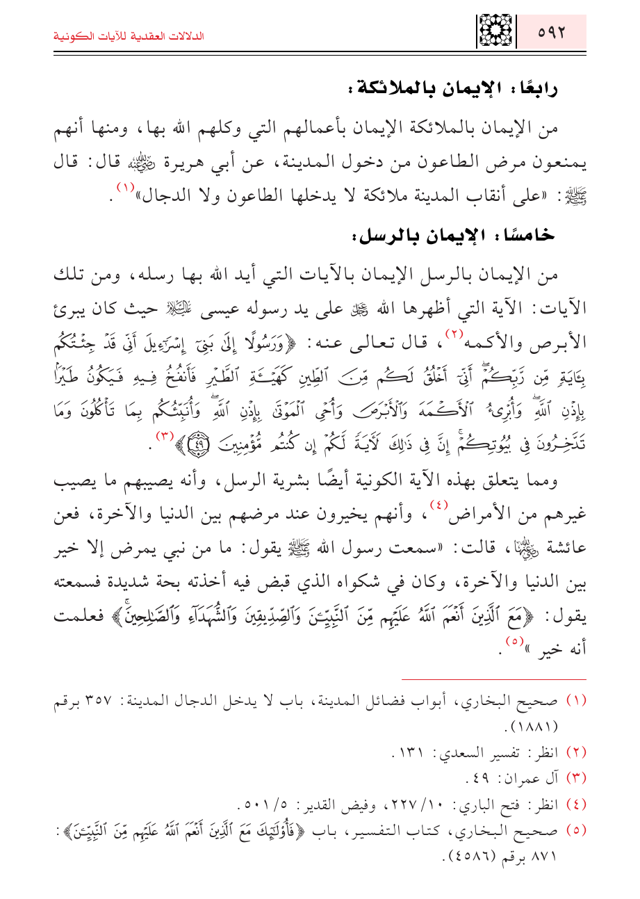 (¬١) صحيح البخاري، أبواب فضائل المدينة، باب لا يدخل الدجال المدينة: ٣٥٧ برقم (١٨٨١).