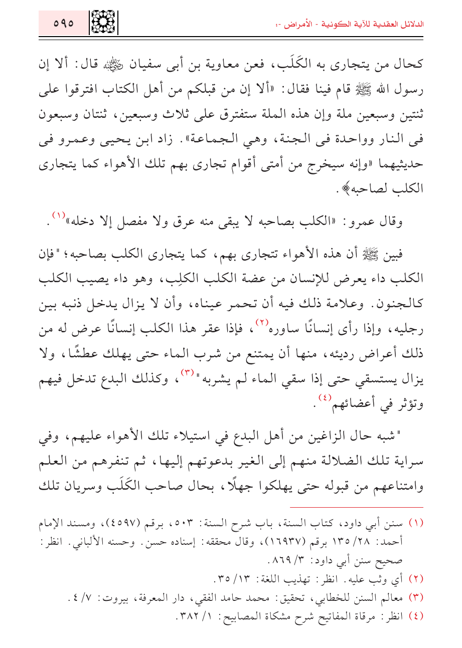 كحال من يتجارى به الكَلَب، فعن معاوية بن أبى سفيان - رضي الله عنه - قال: ألا إن رسول الله - صلى الله عليه وسلم - قام فينا فقال: "ألا إن من قبلكم من أهل الكتاب افترقوا على ثنتين وسبعين ملة وإن هذه الملة ستفترق على ثلاث وسبعين، ثنتان وسبعون فى النار وواحدة فى الجنة، وهي الجماعة". زاد ابن يحيى وعمرو فى حديثيهما " وإنه سيخرج من أمتى أقوام تجارى بهم تلك الأهواء كما يتجارى الكلب لصاحبه ".