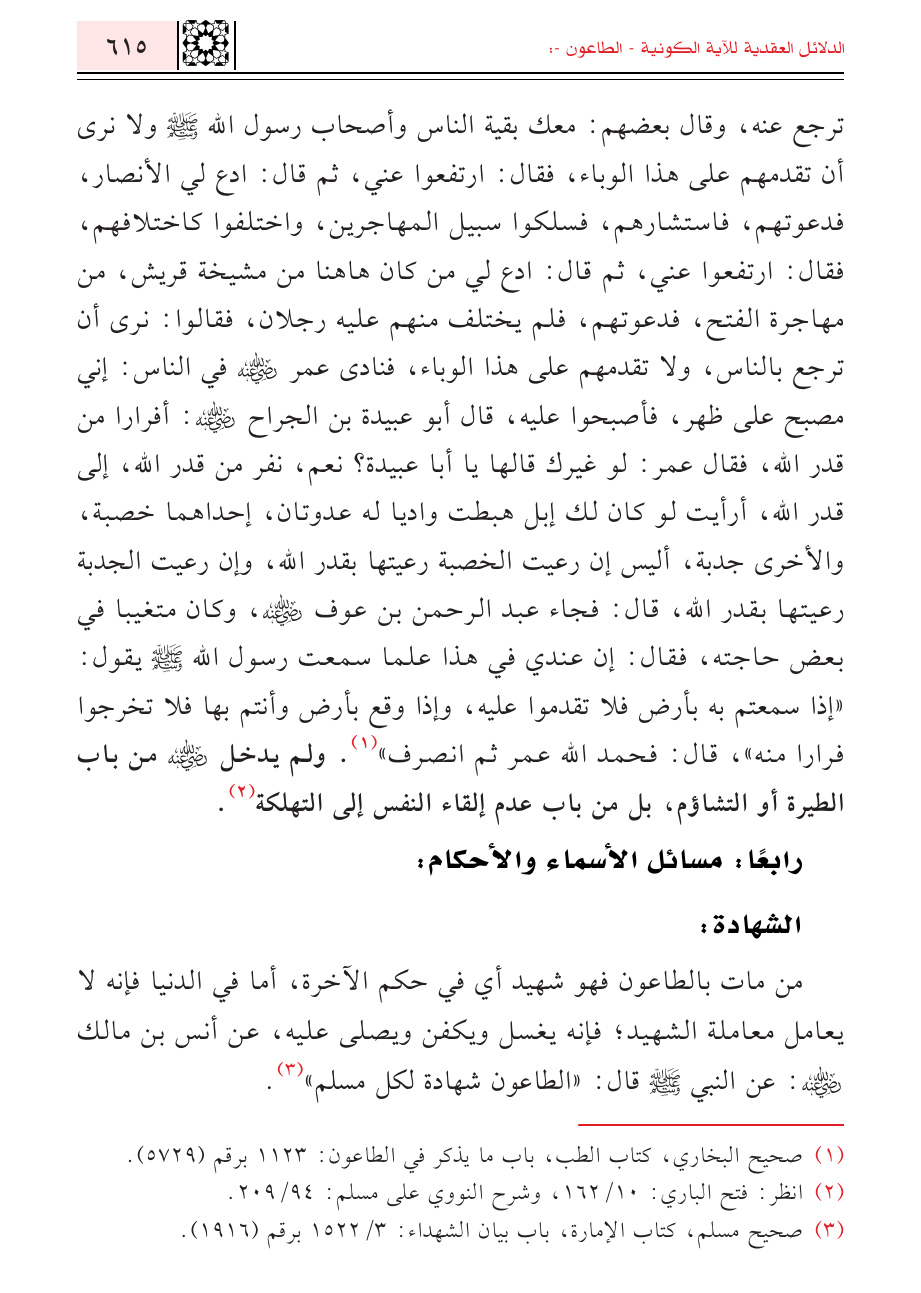 (¬١) صحيح البخاري، كتاب الطب، باب ما يذكر في الطاعون: ١١٢٣ برقم (٥٧٢٩).