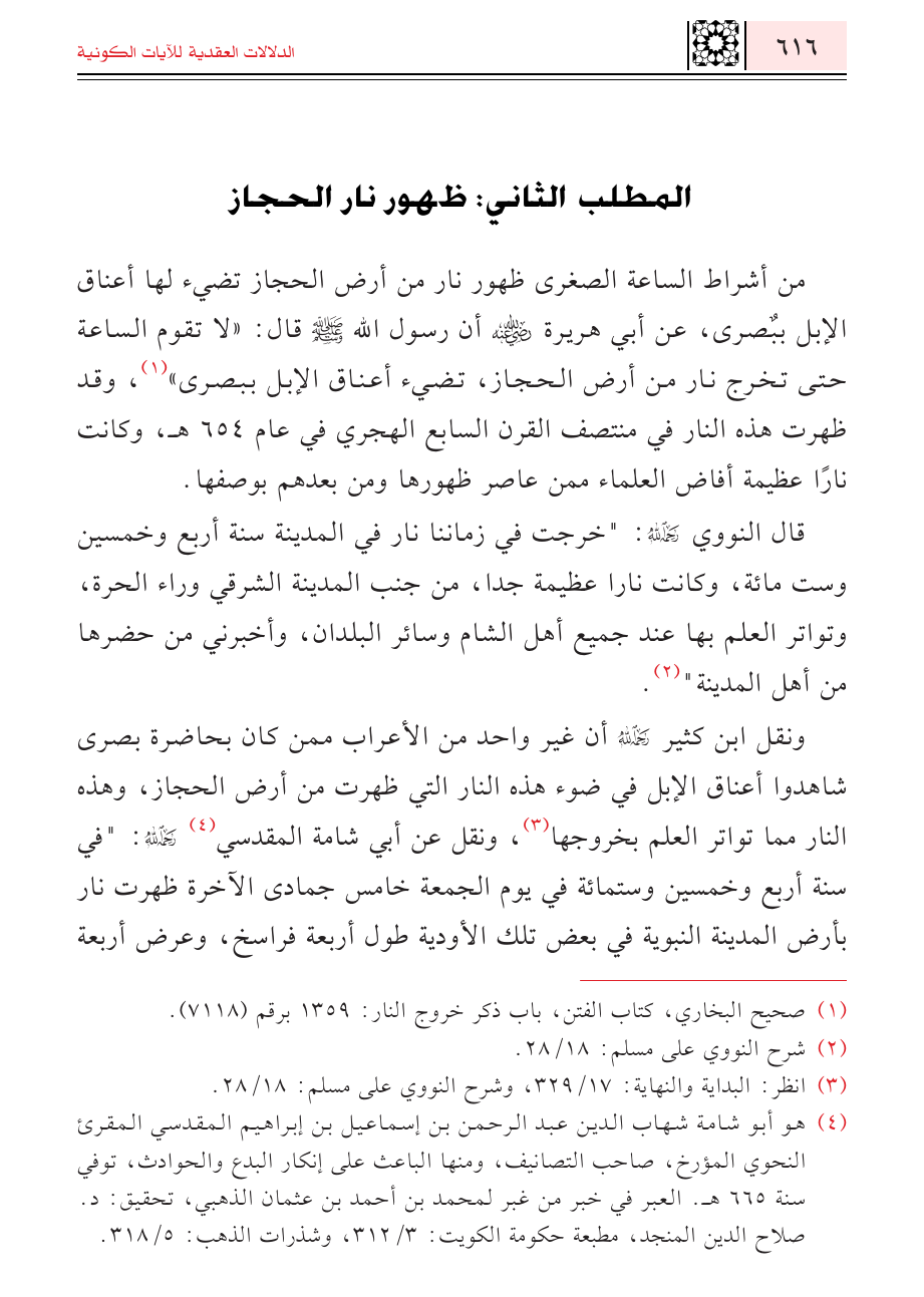 ونقل ابن كثير - رحمه الله - أن غير واحد من الأعراب ممن كان بحاضرة بصرى شاهدوا أعناق الإبل في ضوء هذه النار التي ظهرت من أرض الحجاز، وهذه النار مما تواتر العلم بخروجها (¬٣)، ونقل عن أبي شامة المقدسي (¬٤): " في سنة أربع وخمسين وستمائة في يوم الجمعة خامس جمادى الآخرة ظهرت نار بأرض المدينة النبوية في بعض تلك الأودية طول أربعة فراسخ، وعرض أربعة