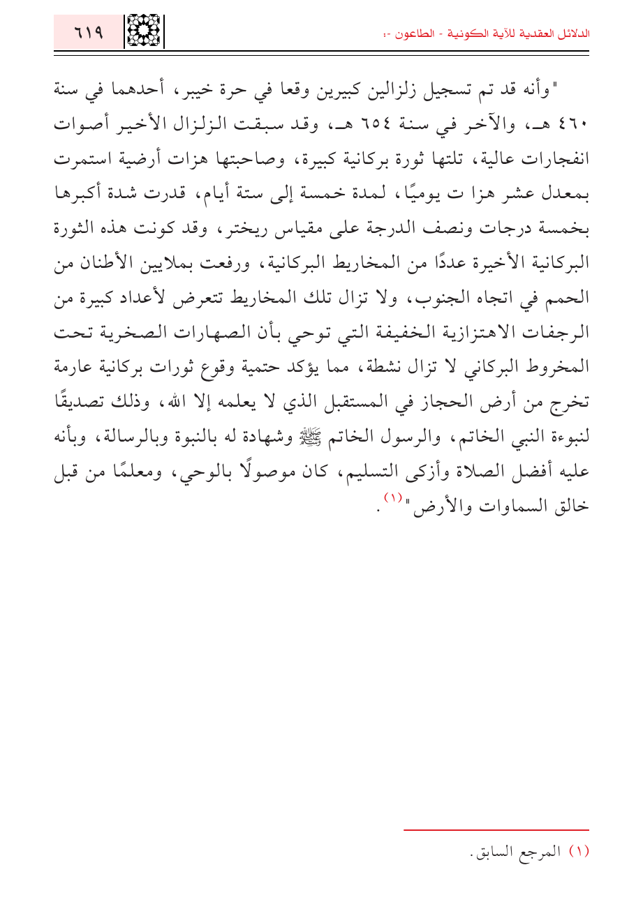 "وأنه قد تم تسجيل زلزالين كبيرين وقعا في حرة خيبر, أحدهما في سنة ٤٦٠ هـ, والآخر في سنة ٦٥٤ هـ, وقد سبقت الزلزال الأخير أصوات انفجارات عالية, تلتها ثورة بركانية كبيرة, وصاحبتها هزات أرضية استمرت بمعدل عشر هزا ت يوميًا، لمدة خمسة إلى ستة أيام، قدرت شدة أكبرها بخمسة درجات ونصف الدرجة على مقياس ريختر, وقد كونت هذه الثورة البركانية الأخيرة عددًا من المخاريط البركانية, ورفعت بملايين الأطنان من الحمم في اتجاه الجنوب, ولا تزال تلك المخاريط تتعرض لأعداد كبيرة من الرجفات الاهتزازية الخفيفة التي توحي بأن الصهارات الصخرية تحت المخروط البركاني لا تزال نشطة, مما يؤكد حتمية وقوع ثورات بركانية عارمة تخرج من أرض الحجاز في المستقبل الذي لا يعلمه إلا الله, وذلك تصديقًا لنبوءة النبي الخاتم, والرسول الخاتم - صلى الله عليه وسلم - وشهادة له بالنبوة وبالرسالة , وبأنه عليه أفضل الصلاة وأزكى التسليم، كان موصولاً بالوحي, ومعلمًا من قبل خالق السماوات والأرض" (¬١).