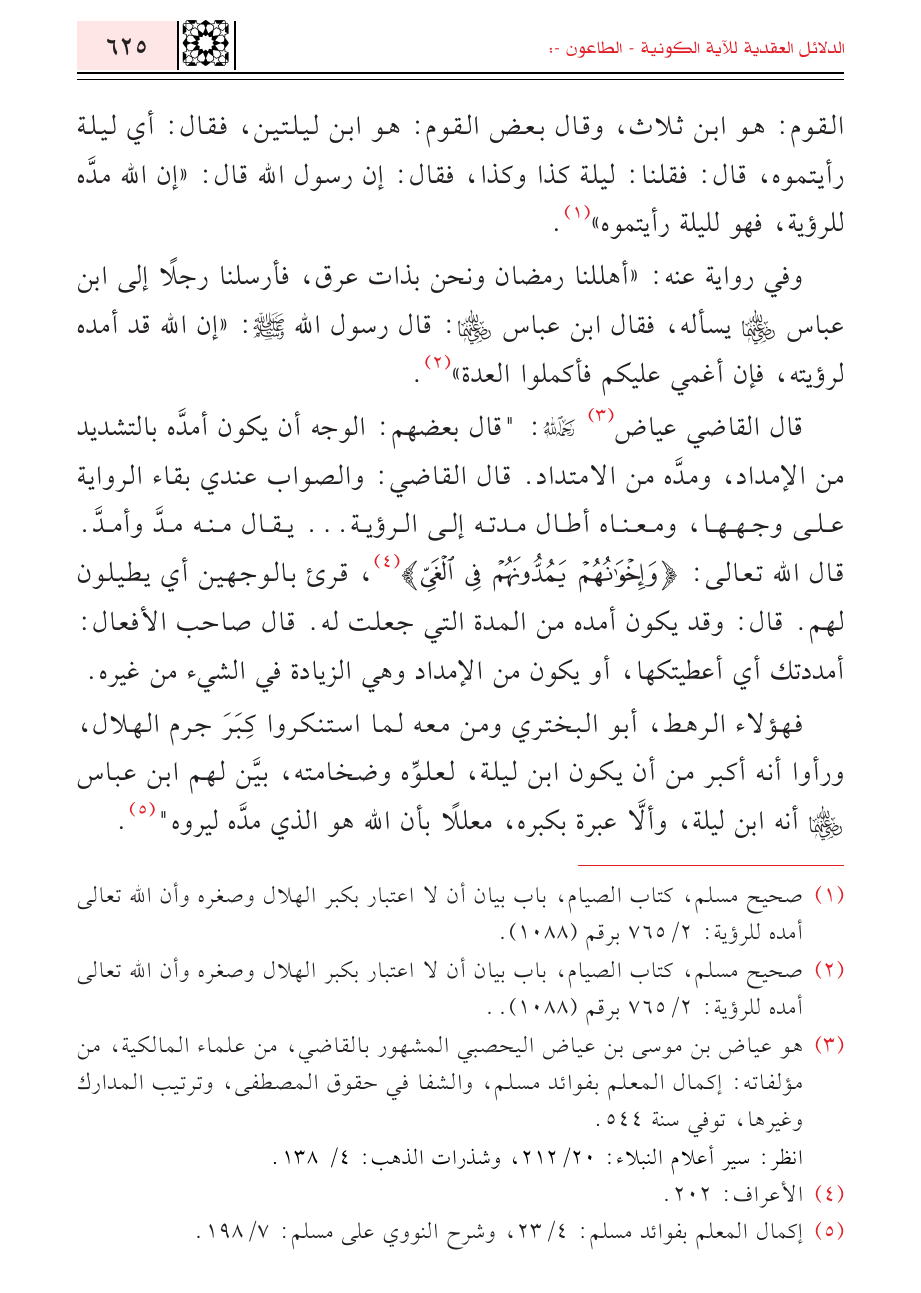 فهؤلاء الرهط، أبو البختري ومن معه لما استنكروا كِبَرَ جرم الهلال، ورأوا أنه أكبر من أن يكون ابن ليلة، لعلوِّه وضخامته، بيَّن لهم ابن عباس - رضي الله عنهما - أنه ابن ليلة، وألَاّ عبرة بكبره، معللاً بأن الله هو الذي مدَّه ليروه" (¬٥).