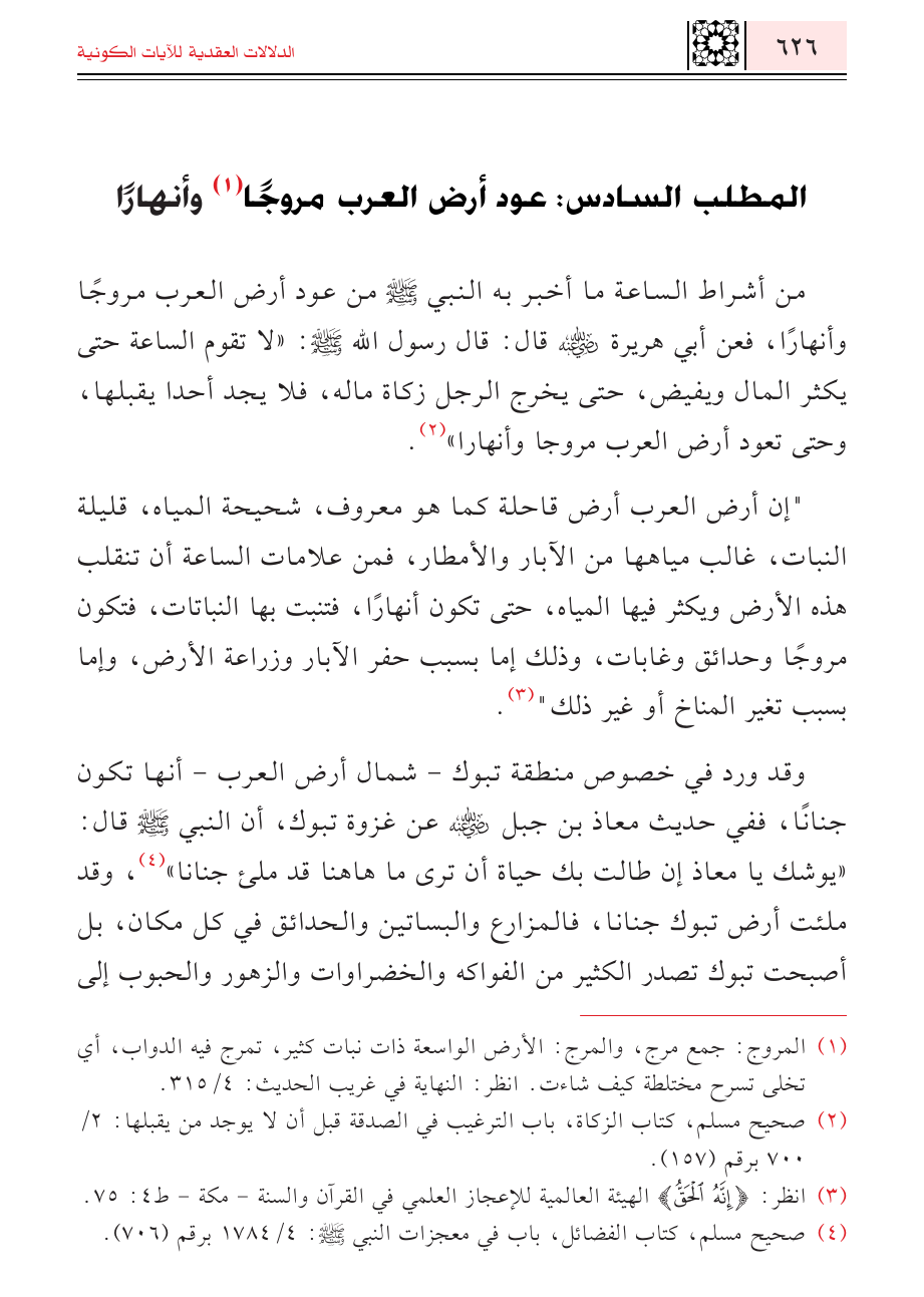 من أشراط الساعة ما أخبر به النبي - صلى الله عليه وسلم - من عود أرض العرب مروجاً وأنهاراً، فعن أبي هريرة - رضي الله عنه - قال: قال رسول الله - صلى الله عليه وسلم -: " لا تقوم الساعة حتى يكثر المال ويفيض، حتى يخرج الرجل زكاة ماله، فلا يجد أحدا يقبلها، وحتى تعود أرض العرب مروجاً وأنهارا" (¬٢).