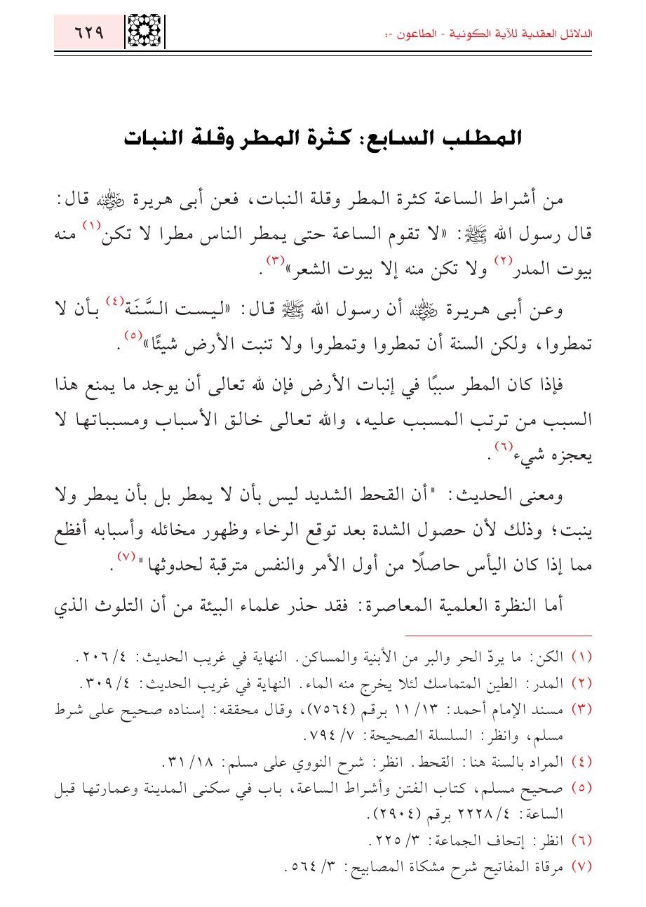 وعن أبى هريرة - رضي الله عنه - أن رسول الله - صلى الله عليه وسلم - قال: "ليست السَّنَة (¬٤) بأن لا تمطروا، ولكن السنة أن تمطروا وتمطروا ولا تنبت الأرض شيئاً " (¬٥).