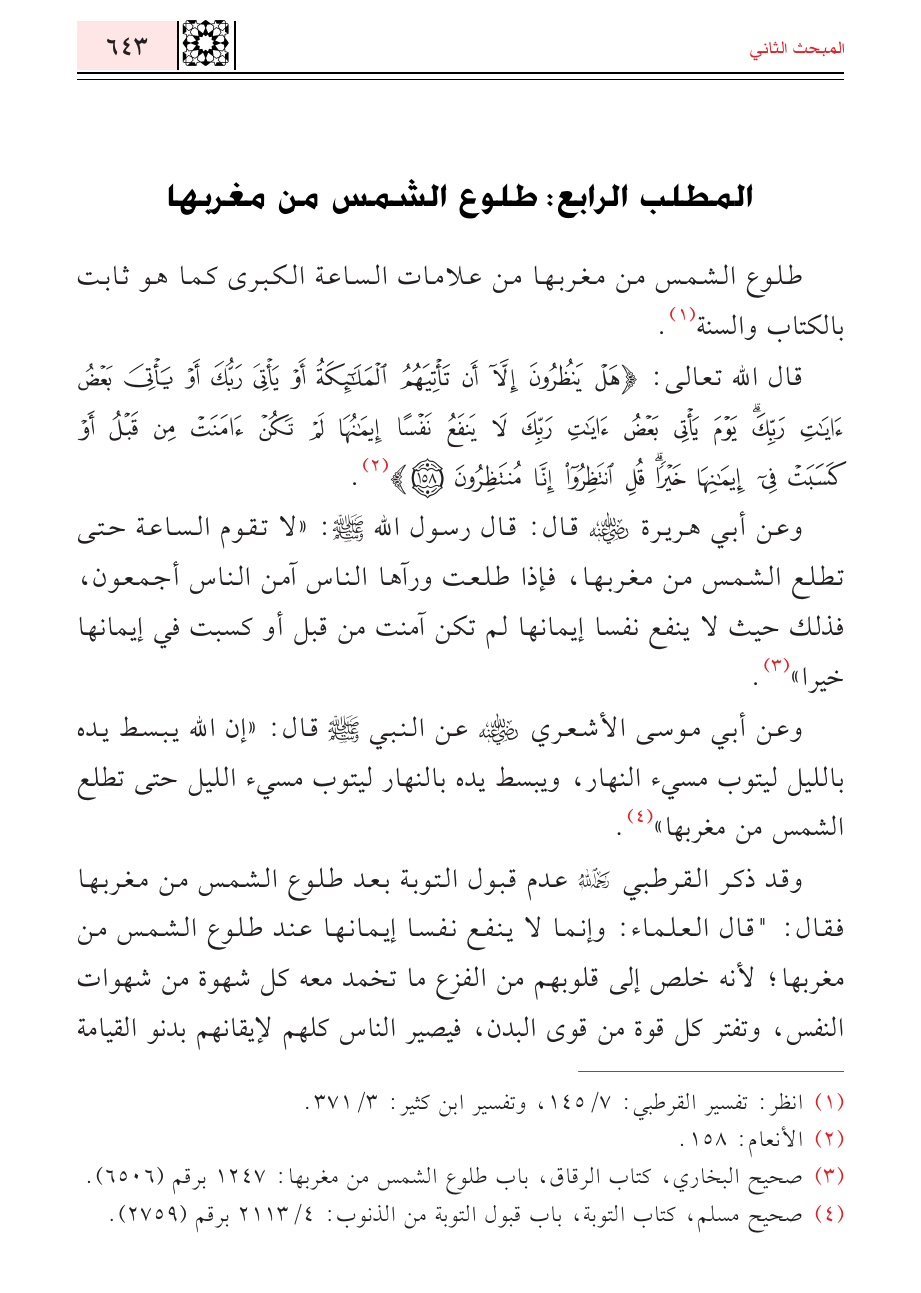 (¬٣) صحيح البخاري، كتاب الرقاق، باب طلوع الشمس من مغربها: ١٢٤٧ برقم (٦٥٠٦).