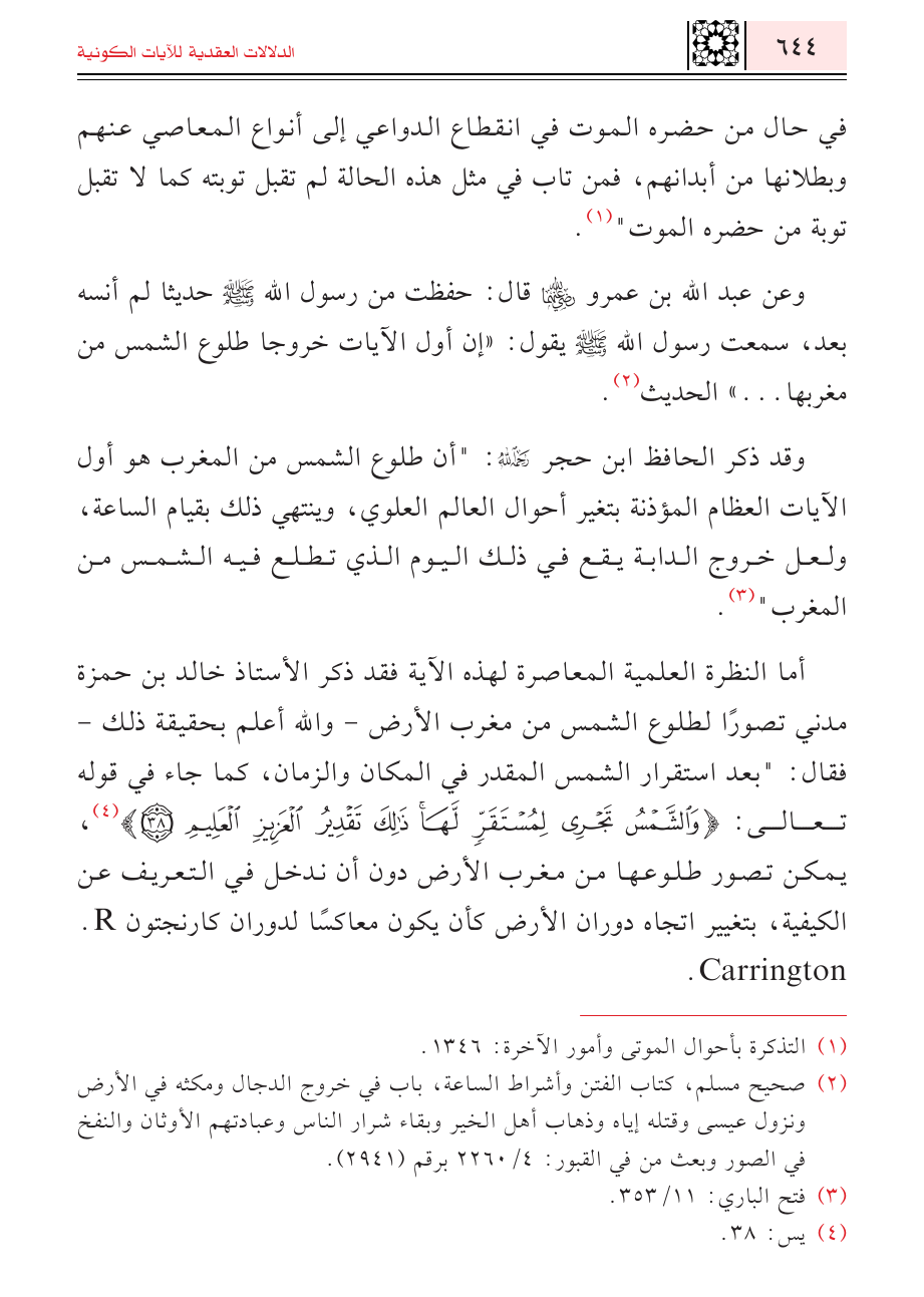 وقد ذكر الحافظ ابن حجر - رحمه الله -: " أن طلوع الشمس من المغرب هو أول الآيات العظام المؤذنة بتغير أحوال العالم العلوي، وينتهي ذلك بقيام الساعة، ولعل خروج الدابة يقع في ذلك اليوم الذي تطلع فيه الشمس من المغرب" (¬٣).