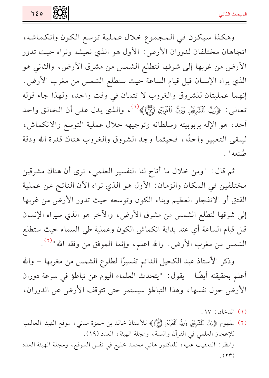وهكذا سيكون في المجموع خلال عملية توسع الكون وانكماشه، اتجاهان مختلفان لدوران الأرض: الأول هو الذي نعيشه ونراه حيث تدور الأرض من غربها إلى شرقها لتطلع الشمس من مشرق الأرض، والثاني هو الذي يراه الإنسان قبل قيام الساعة حيث ستطلع الشمس من مغرب الأرض. إنهما عمليتان للشروق والغروب لا تتمان في وقت واحد، ولهذا جاء قوله تعالى: {رَبُّ الْمَشْرِقَيْنِ وَرَبُّ الْمَغْرِبَيْنِ} (¬١)، والذي يدل على أن الخالق واحد أحد، هو الإله بربوبيته وسلطانه وتوجيهه خلال عملية التوسع والانكماش، ليبقى التعبير واحدًا، فحيثما وجد الشروق والغروب هناك قدرة الله ودقة صُنعه".