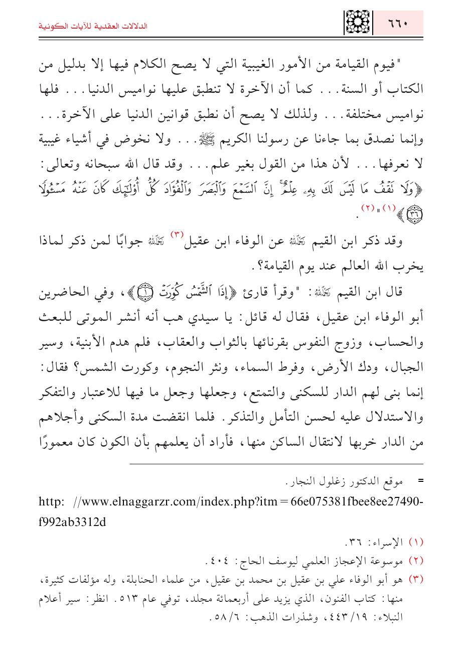 " فيوم القيامة من الأمور الغيبية التي لا يصح الكلام فيها إلا بدليل من الكتاب أو السنة ... كما أن الآخرة لا تنطبق عليها نواميس الدنيا ... فلها نواميس مختلفة ... ولذلك لا يصح أن نطبق قوانين الدنيا على الآخرة ... وإنما نصدق بما جاءنا عن رسولنا الكريم - صلى الله عليه وسلم - ... ولا نخوض في أشياء غيبية لا نعرفها ... لأن هذا من القول بغير علم ... وقد قال الله سبحانه وتعالى: {وَلَا تَقْفُ مَا لَيْسَ لَكَ بِهِ عِلْمٌ إِنَّ السَّمْعَ وَالْبَصَرَ وَالْفُؤَادَ كُلُّ أُولَئِكَ كَانَ عَنْهُ مَسْئُولًا} (¬١) " (¬٢).