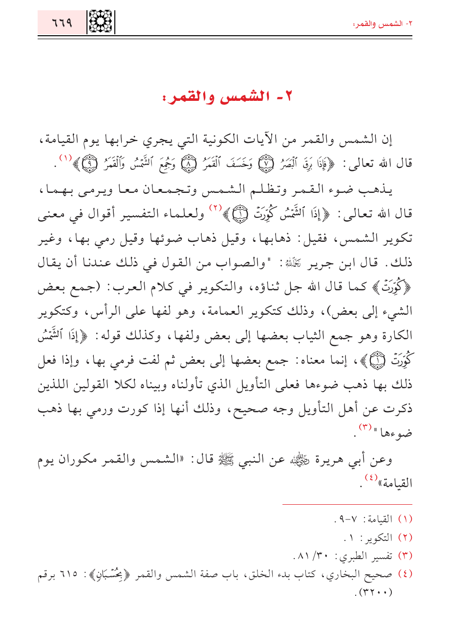 يذهب ضوء القمر وتظلم الشمس وتجمعان معا ويرمى بهما، قال الله تعالى: {إِذَا الشَّمْسُ كُوِّرَتْ} (¬٢) ولعلماء التفسير أقوال في معنى تكوير الشمس، فقيل: ذهابها، وقيل ذهاب ضوئها وقيل رمي بها، وغير ذلك. قال ابن جرير - رحمه الله -: " والصواب من القول في ذلك عندنا أن يقال {كُوِّرَتْ} كما قال الله جل ثناؤه، والتكوير في كلام العرب: (جمع بعض الشيء إلى بعض)، وذلك كتكوير العمامة، وهو لفها على الرأس، وكتكوير الكارة وهو جمع الثياب بعضها إلى بعض ولفها، وكذلك قوله: {إِذَا الشَّمْسُ كُوِّرَتْ}، إنما معناه: جمع بعضها إلى بعض ثم لفت فرمي بها، وإذا فعل ذلك بها ذهب ضوءها فعلى التأويل الذي تأولناه وبيناه لكلا القولين اللذين ذكرت عن أهل التأويل وجه صحيح، وذلك أنها إذا كورت ورمي بها ذهب ضوءها" (¬٣).