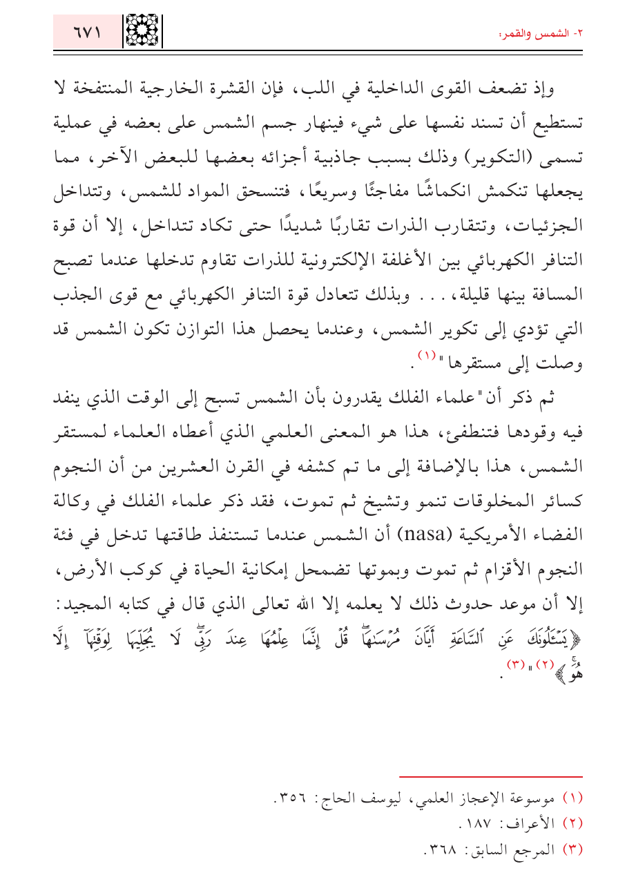 ثم ذكر أن"علماء الفلك يقدرون بأن الشمس تسبح إلى الوقت الذي ينفد فيه وقودها فتنطفئ، هذا هو المعنى العلمي الذي أعطاه العلماء لمستقر الشمس، هذا بالإضافة إلى ما تم كشفه في القرن العشرين من أن النجوم كسائر المخلوقات تنمو وتشيخ ثم تموت، فقد ذكر علماء الفلك في وكالة الفضاء الأمريكية (nasa) أن الشمس عندما تستنفذ طاقتها تدخل في فئة النجوم الأقزام ثم تموت وبموتها تضمحل إمكانية الحياة في كوكب الأرض، إلا أن موعد حدوث ذلك لا يعلمه إلا الله تعالى الذي قال في كتابه المجيد: {يَسْأَلُونَكَ عَنِ السَّاعَةِ أَيَّانَ مُرْسَاهَا قُلْ إِنَّمَا عِلْمُهَا عِنْدَ رَبِّي لَا يُجَلِّيهَا لِوَقْتِهَا إِلَّا هُوَ} (¬٢) " (¬٣).