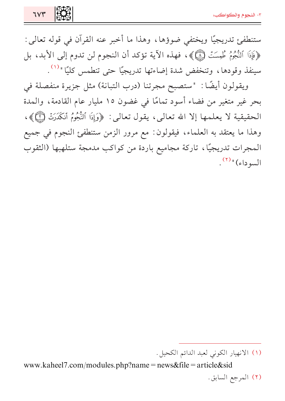 ستنطفئ تدريجياً ويختفي ضوؤها، وهذا ما أخبر عنه القرآن في قوله تعالى: {فَإِذَا النُّجُومُ طُمِسَتْ}، فهذه الآية تؤكد أن النجوم لن تدوم إلى الأبد، بل سينفذ وقودها، وتنخفض شدة إضاءتها تدريجياً حتى تنطمس كلياً" (¬١).