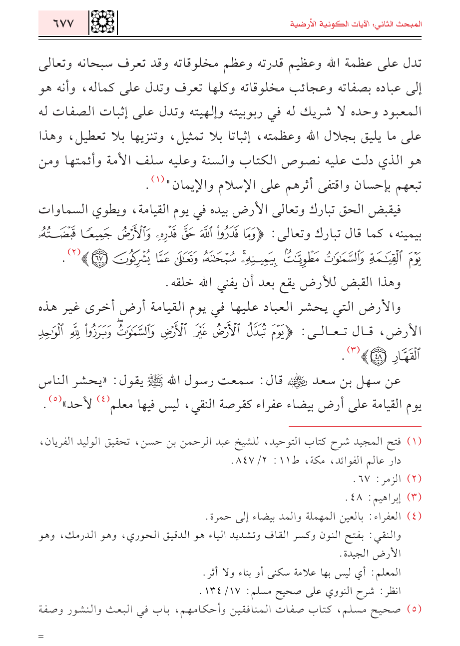 فيقبض الحق تبارك وتعالى الأرض بيده في يوم القيامة، ويطوي السماوات بيمينه، كما قال تبارك وتعالى: {وَمَا قَدَرُوا اللَّهَ حَقَّ قَدْرِهِ وَالْأَرْضُ جَمِيعًا قَبْضَتُهُ يَوْمَ الْقِيَامَةِ وَالسَّمَاوَاتُ مَطْوِيَّاتٌ بِيَمِينِهِ سُبْحَانَهُ وَتَعَالَى عَمَّا يُشْرِكُونَ} (¬٢).