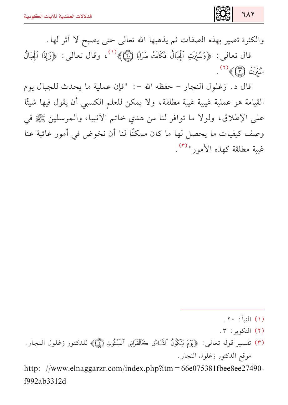 " قال د. زغلول النجار -حفظه الله-: "فإن عملية ما يحدث للجبال يوم القيامة هو عملية غيبية غيبة مطلقة، ولا يمكن للعلم الكسبي أن يقول فيها شيئاً على الإطلاق، ولولا ما توافر لنا من هدي خاتم الأنبياء والمرسلين - صلى الله عليه وسلم - في وصف كيفيات ما يحصل لها ما كان ممكناً لنا أن نخوض في أمور غائبة عنا غيبة مطلقة كهذه الأمور" (¬٣).