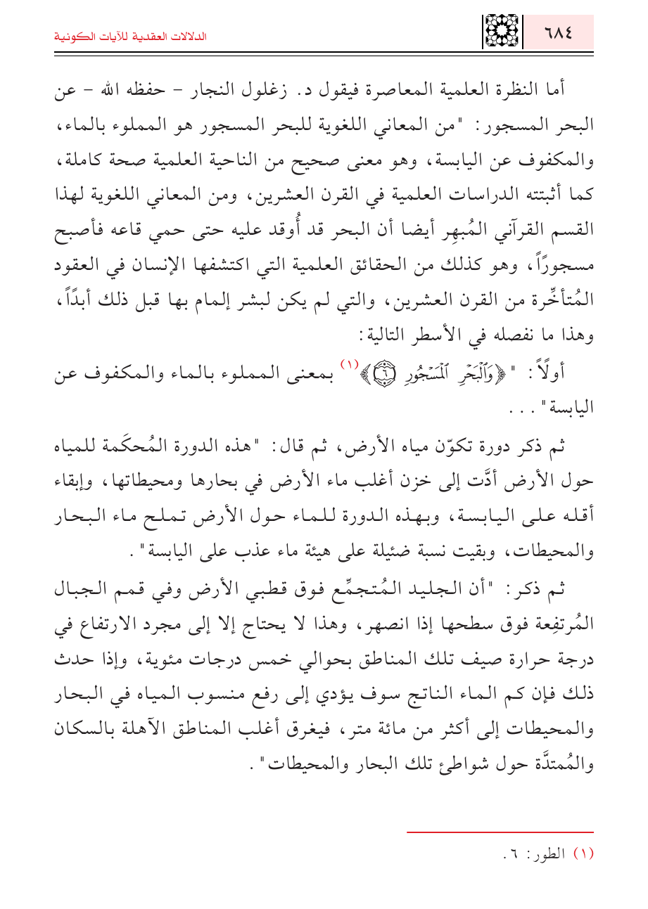 أولًا: " {وَالْبَحْرِ الْمَسْجُورِ} (¬١) بمعنى المملوء بالماء والمكفوف عن اليابسة " ...