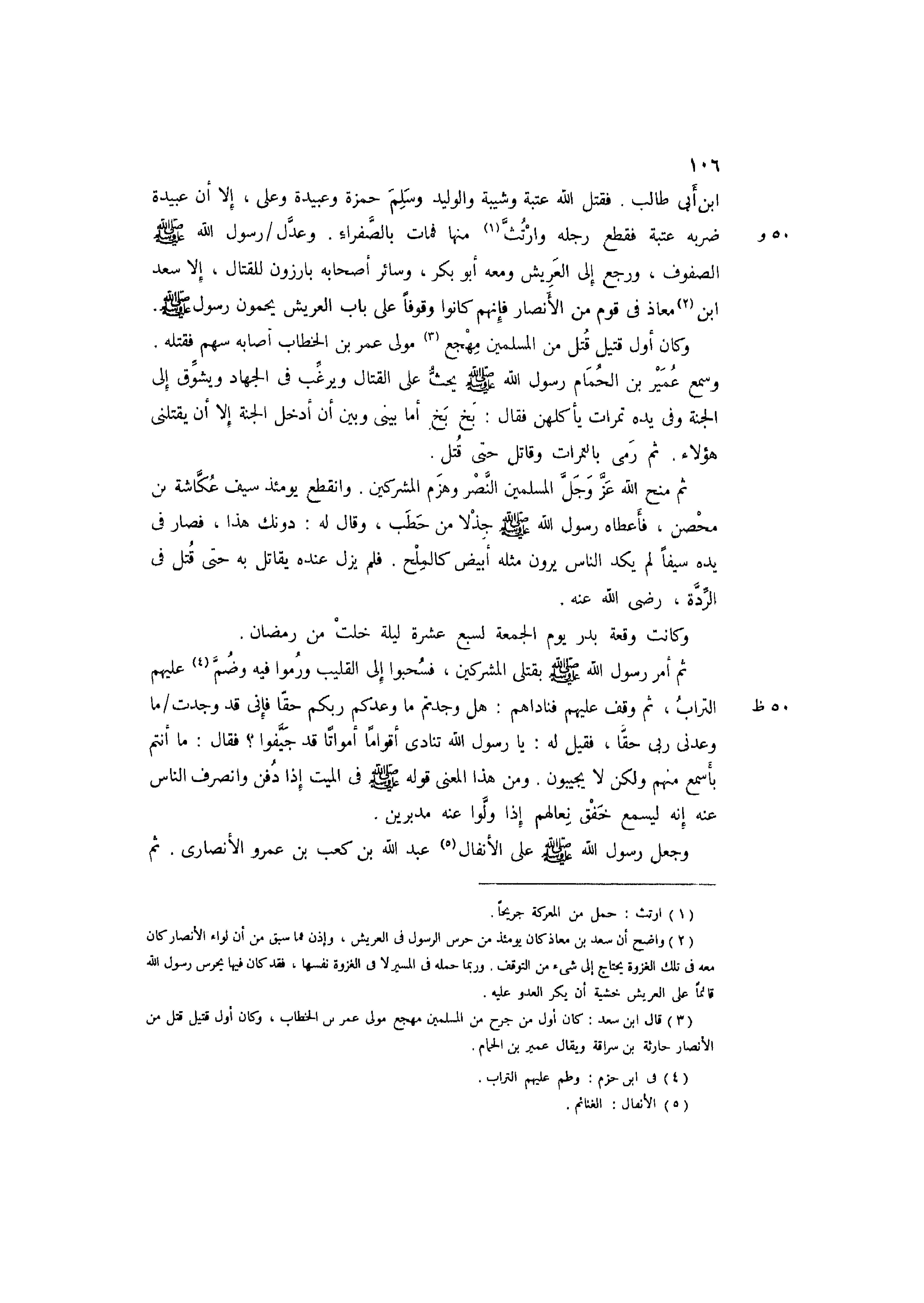 3 قَالَ ابْن سعد: كَانَ أول من جرح من الْمُسلمين مهجع مولى عمر بن الْخطاب، وَكَانَ أول قَتِيل قتل من الْأَنْصَار حَارِثَة بن سراقَة وَيُقَال عُمَيْر بن الْحمام.