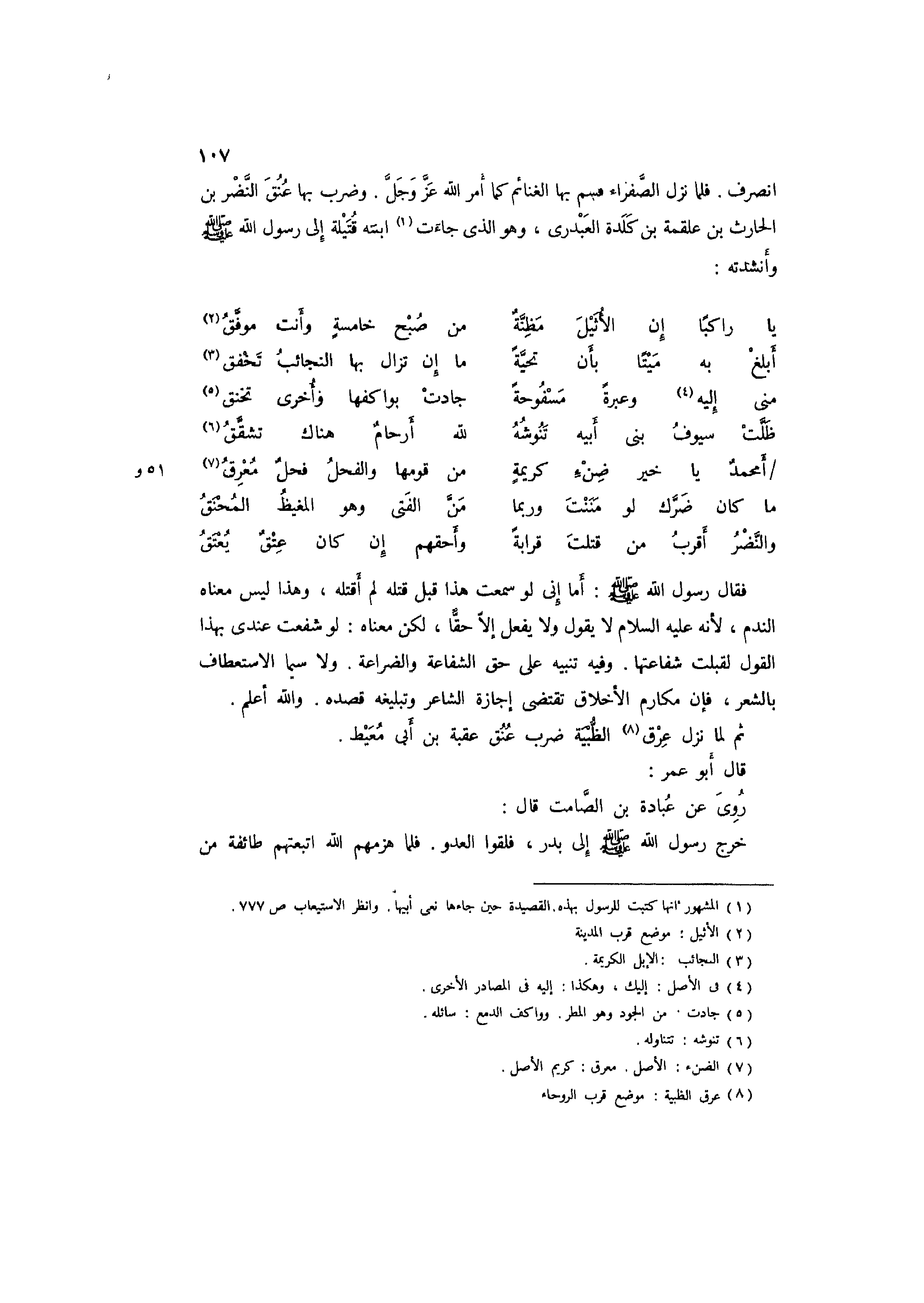 ثمَّ انْصَرف. فَلَمَّا نزل الصَّفْرَاء قسم بهَا الْغَنَائِم كَمَا أَمر اللَّه عز وَجل. وَضرب بهَا عنق النَّضر بْن الْحَارِث بْن عَلْقَمَة بْن كلدة الْعَبدَرِي، وَهُوَ الَّذِي جَاءَت1 ابْنَته قتيلة إِلَى رَسُولُ اللَّهِ صَلَّى اللَّهُ عَلَيْهِ وَسَلَّمَ وأنشدته: