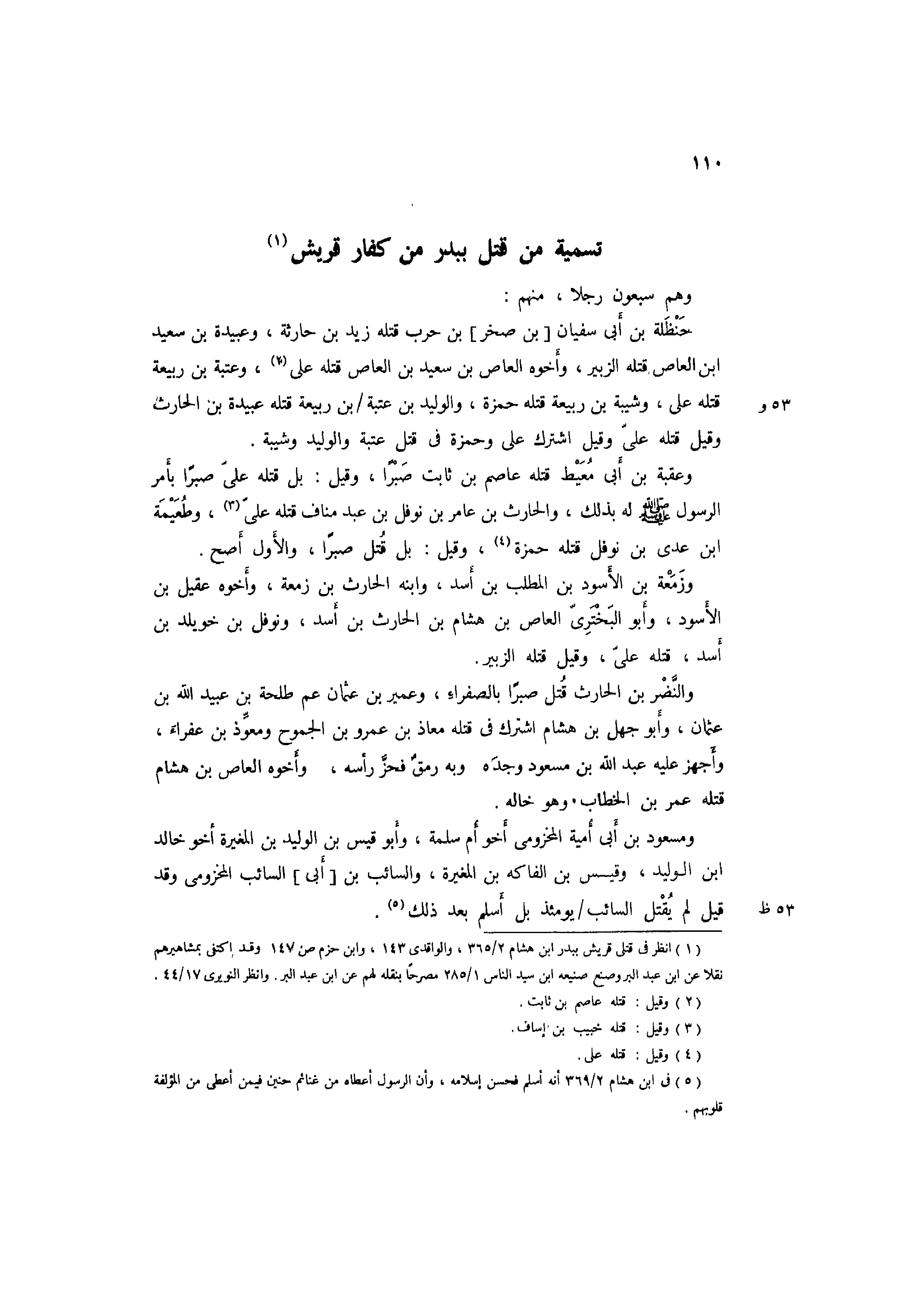 1 انْظُر فِي قَتْلَى قُرَيْش ببدر ابْن هِشَام 2/ 365، والواقدي 143، وَابْن حزم ص147 وَقد اكْتفى بمشاهيرهم نقلا عَن ابْن عبد الْبر وصنع صَنِيعه ابْن سيد النَّاس 1/ 285 مُصَرحًا بنقله لَهُم عَن ابْن عبد الْبر. وَانْظُر النويري 17/ 44.